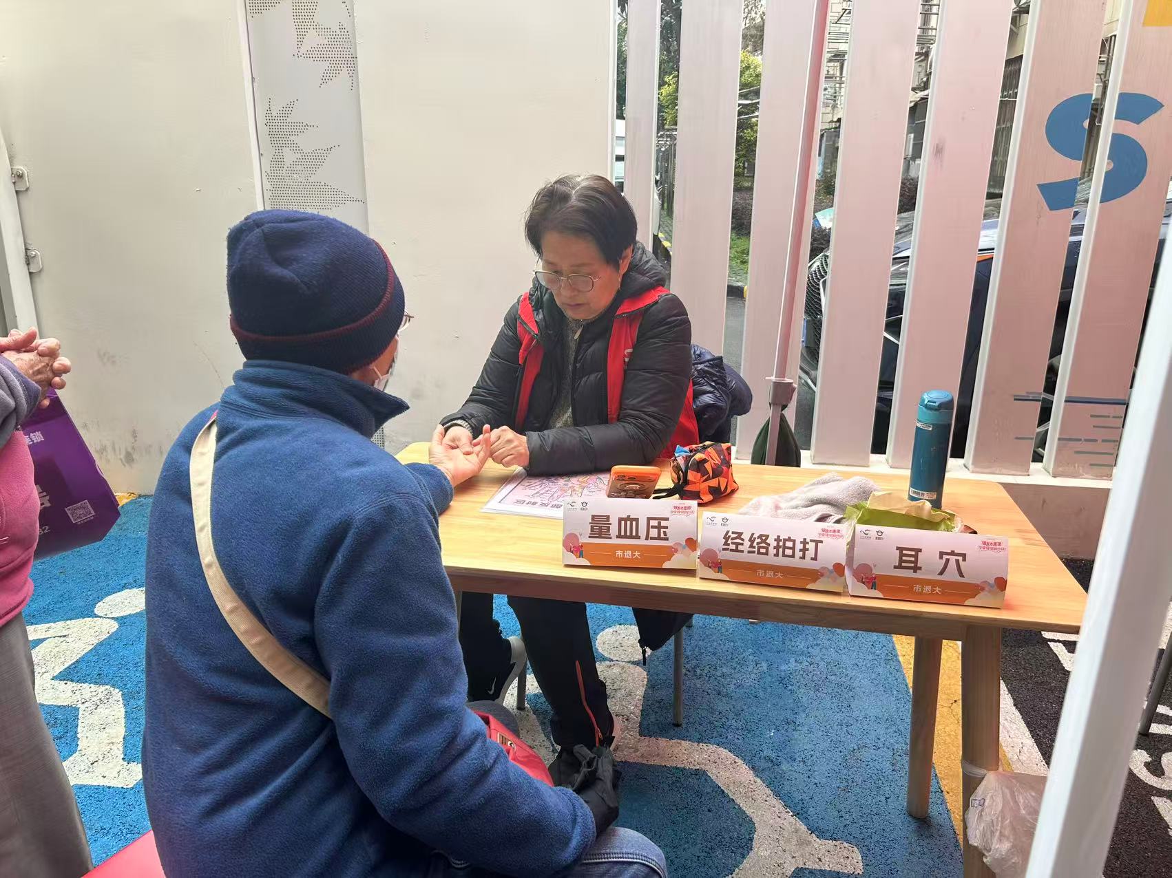 现场还设置了法律、心理、保险等咨询服务,以及耳穴、经络拍打、推拿等健康保健项目。中国结制作和剪纸等非遗体验摊位也吸引了不少居民参与,大家边学边聊,气氛热络。