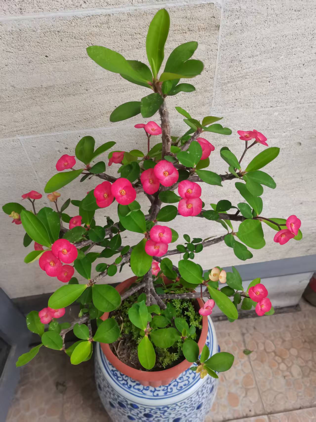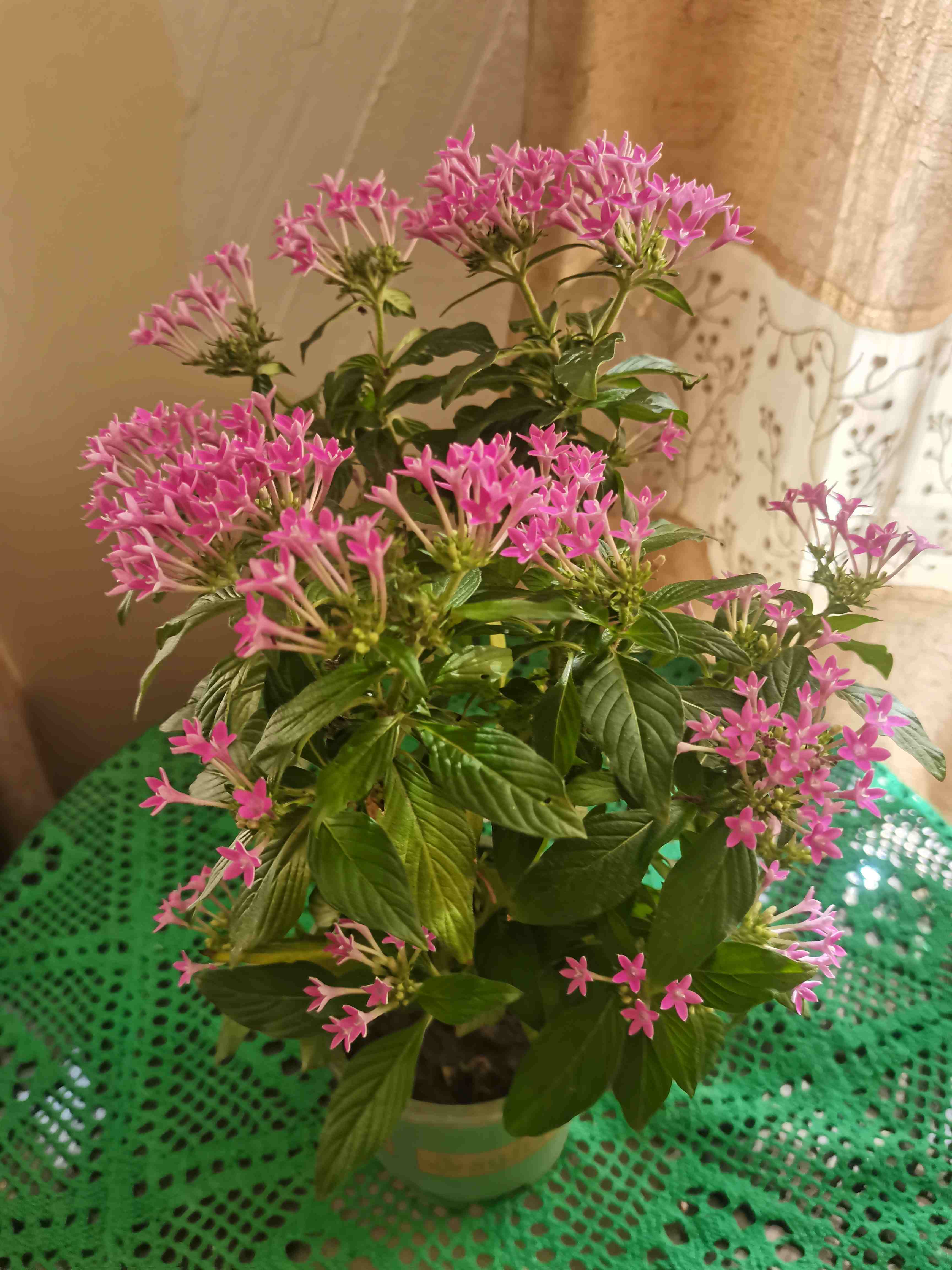 除了虎刺梅,还有一盆开得极好的繁星花。繁星花属于小灌木型植物,高度不过50厘米,原生于东非和西亚的热带地区,它的分枝能力很强,不需要刻意打顶,也能长出大量侧枝,株型灌幅饱满,而且它不需要大盆移栽,一加仑的小花盆足够让它生长开花,所以非常省心。比起虎刺梅,繁星花稍微有点娇气,怕大太阳,一日暴晒,枝叶会耷拉下来。不过只要浇透水,不让阳光直晒,就又会神奇地挺立,绽放出一簇簇花朵,并且越开越多。仔细看去,繁星花的花朵为聚伞花序状,每个花序上可同时开出几十朵小花,花瓣呈五角星状,粉色的花朵在低矮茂密的叶片簇拥下,美丽而安静。夜空下,露台上绽放的繁星花密集的聚伞花序宛如夜空中闪烁的点点繁星。想起冰心的散文《繁星》中的句子:“繁星闪烁着——深蓝的天空,何曾听得见他们对语?沉默中,微光里,它们深深地互相颂赞了。”那么貌似抱团取暖的繁星花应该也会彼此对语并互相激励和颂赞吧。