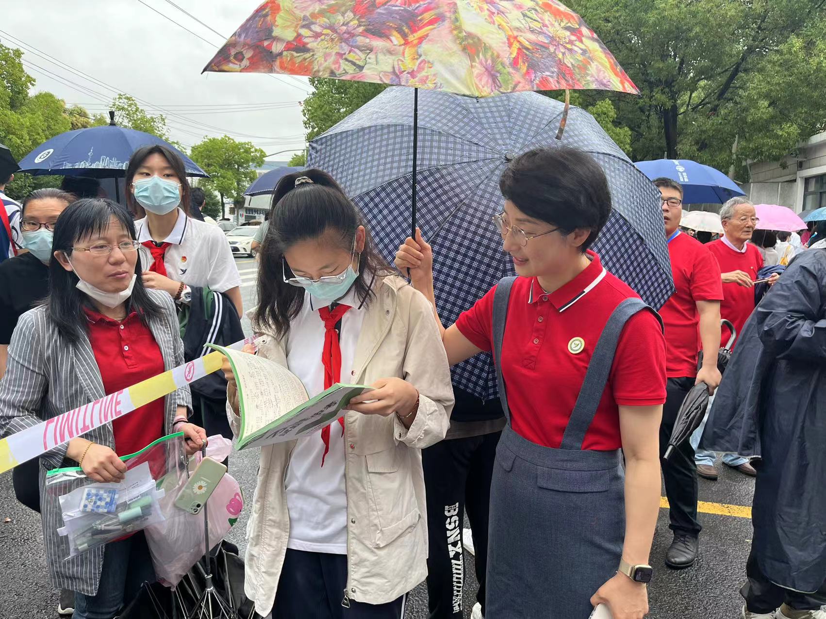 “孩子,不急,老师给你撑伞,你慢慢看。”上海师范大学附属经纬实验学校党支部书记许杰和校长孟飞带队,与九年级班主任、语文老师们共同护送学校的269位考生。当许杰看到一位女生在考点前翻开了语文书,打算再看一眼时,立刻将伞撑了过去。“答题不要慌,作文注意审题,相信自己,老师们都给你加油。”她轻声鼓励着女生,并帮她再次检查了一次考试用品。“老师,再见!我会努力的!”温好书,女生大踏步走进了考点。