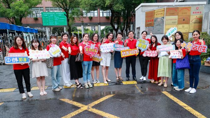 “学霸姐,你终于来了。”8:30分,随着最后一位考生的到来,老师们松了口气。没有学生迟到,也没有学生忘带物品,胜利!老师们心情终于放松起来,拿着准备好的手牌合影。