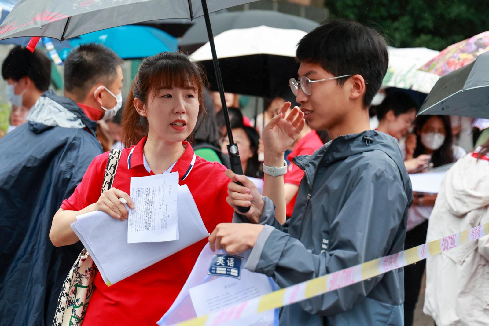 记者在现场看到,老师们手中的伞都偏向了同学们。“孩子们不能淋湿了,不然身上湿哒哒的考试,不舒服。”上师经纬的老师们身穿统一的红色短袖,在人群中十分显眼。“老师,怎么办,我今天带的是电子手表。”一位女生带着哭腔向老师求助。“来,老师的表给你。”老师立刻将自己的表从手腕下拿下,塞在了女生手里。“你看,用老师的表,肯定考神附体!”女生“扑哧”一声笑了,考前紧张情绪被老师的幽默舒缓了。