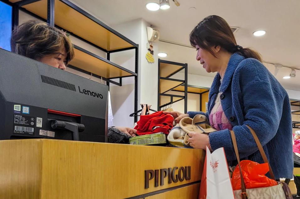 挑选好衣服的顾客正在前台结账。劳动报记者颜筱依 摄影