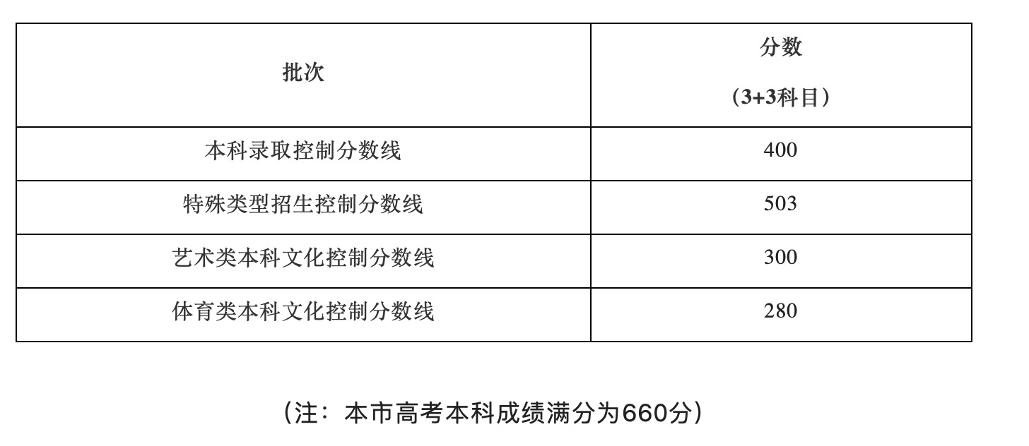 2022年上海高考本科各批次录取控制分数线经刚刚公布。其中,本科录取控制分数线400分,特殊类型招生控制分数线503分,艺术类本科文化控制分数线300分,体育类本科文化控制分数线280分。