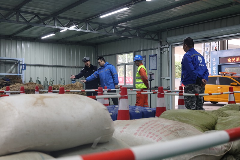 闵行交管高速大队在高速公路养护单位检查融雪剂、草包等防寒应急装备。闵行警方供图