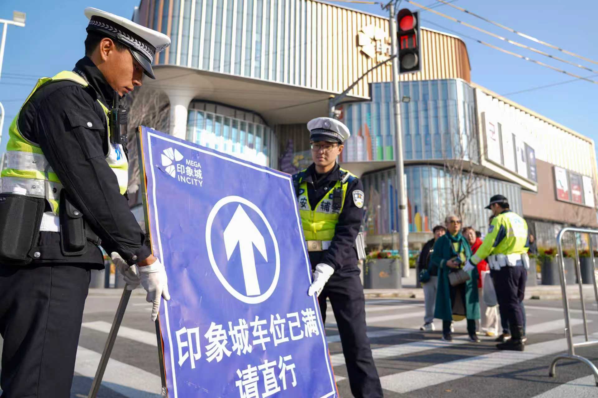 头图为前湾印象城MEGA迎来大客流,闵行公安交管支队视情对相关路口开展临时交通管控措施。闵行警方供图