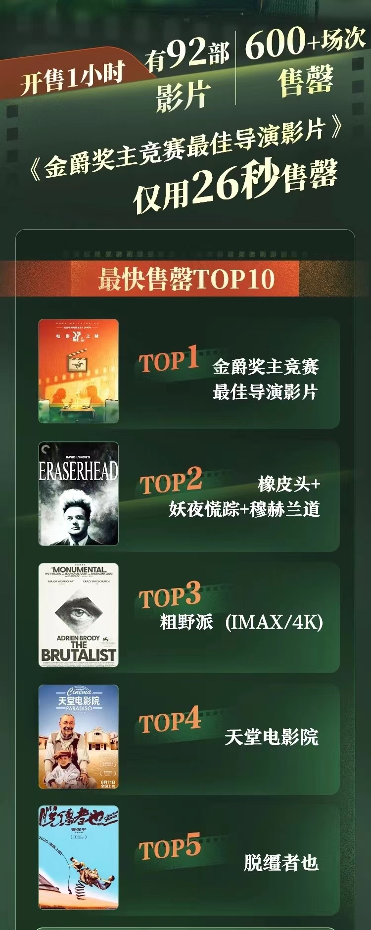 6月5日中午12时,随着淘票票和大麦平台准时跳出“购票”链接,第27届上海国际电影节正式开票。短短1小时,92部影片、超600场放映、37万张票便宣告售罄,其中《金爵奖主竞赛最佳导演片》在26秒内被一抢而空,其他热门场次也几乎“全线飘红”。“电影之城”的节日氛围瞬间拉满,影迷们提前进入了“上影节时间”。