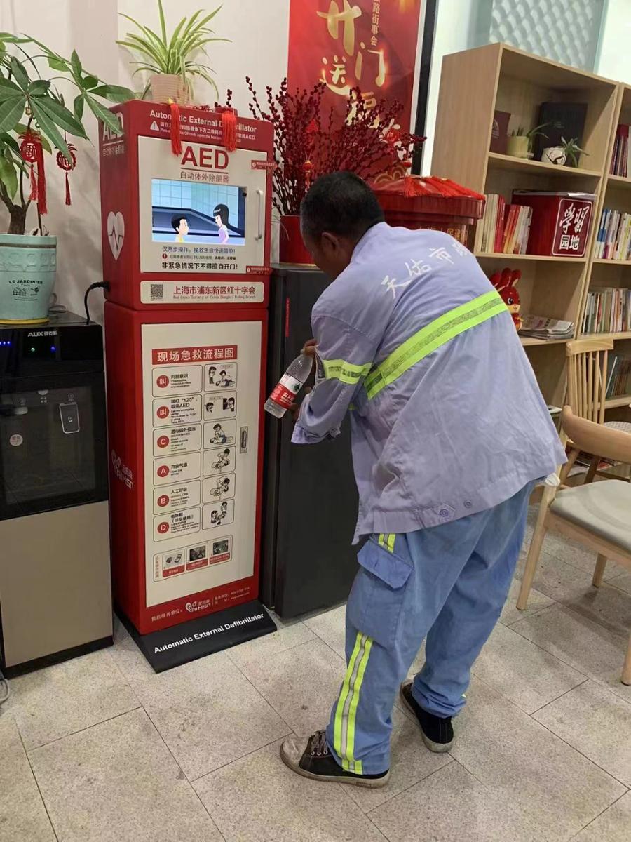 服务站内,来自居委的志愿者正在朝冰箱里添加矿泉水,可供户外劳动者取用,近期高温不断,据工作人员介绍,一天要“补水”多次。