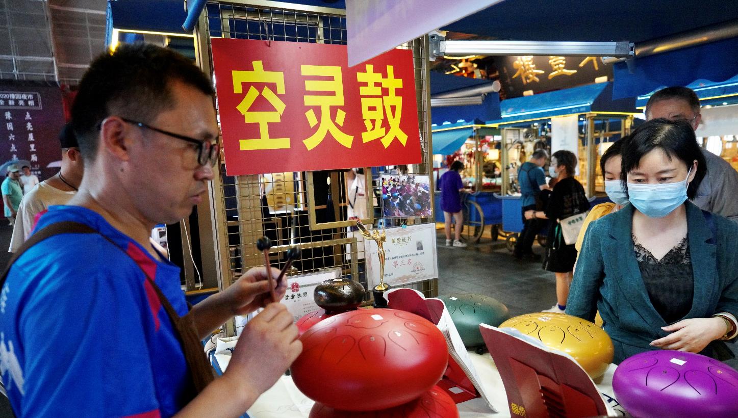 而在剪纸花车的不远处,一首空灵悠长的乐曲引得不少游客驻足,花车上扁圆形的鼓一只只摆放着,游客们可拿起一旁的棒槌在鼓面的莲花瓣音舌上进行敲击,并发出空灵的单音声响。“这个是空灵鼓,又称为钢舌鼓,是由东汉年间的乐器编钟演变而成的打击类乐器。”摊主黄万山2014年开始接触这一乐器,从自己学习这个打击乐器,到研发不同种类、不同音色,着实花了不少力气。
