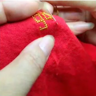 因为作品需要纯手工制作,时间紧张,需要郑晓蓉加班加点。因此,在纹样确定后,郑晓蓉放弃休息加,利用端午小长假,紧挑制。挑花的时候,她左手拿针,右手捏住土布,顺着布势插针,从布眼里引线。挑花的线和布上的纱不能重叠在一起,而且挑花时要保证每一针始终向前,如果改变走向只能将布掉头,这样才能保证正反两面都十分平整。就这样,郑晓蓉每天精工细作挑花10个小时,终于在“七一”前夕完成50枚纪念章挑花和制作。