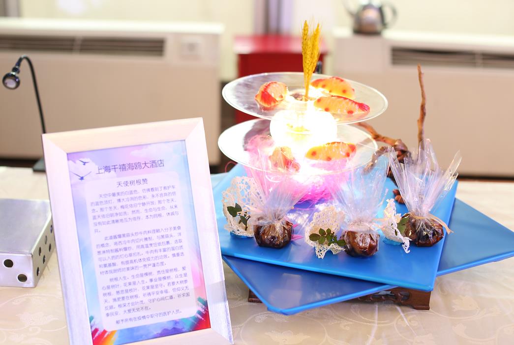 同样富有创意的,还有来自上海千禧海鸥大酒店的天使树根赞,通俗来说就是酱爆黑蒜头炒牛肉。在此道料理中,厨师团队别出心裁,融入了分子美食的概念,将西冷牛肉切片腌制,与黑蒜头、洋葱淋特制酱料爆炒,用高温烹饪纸包裹。“我们想用这样一道既讲健康又有创意的菜品,向所有在疫情中职守的逆行者们敬意。”主厨说。