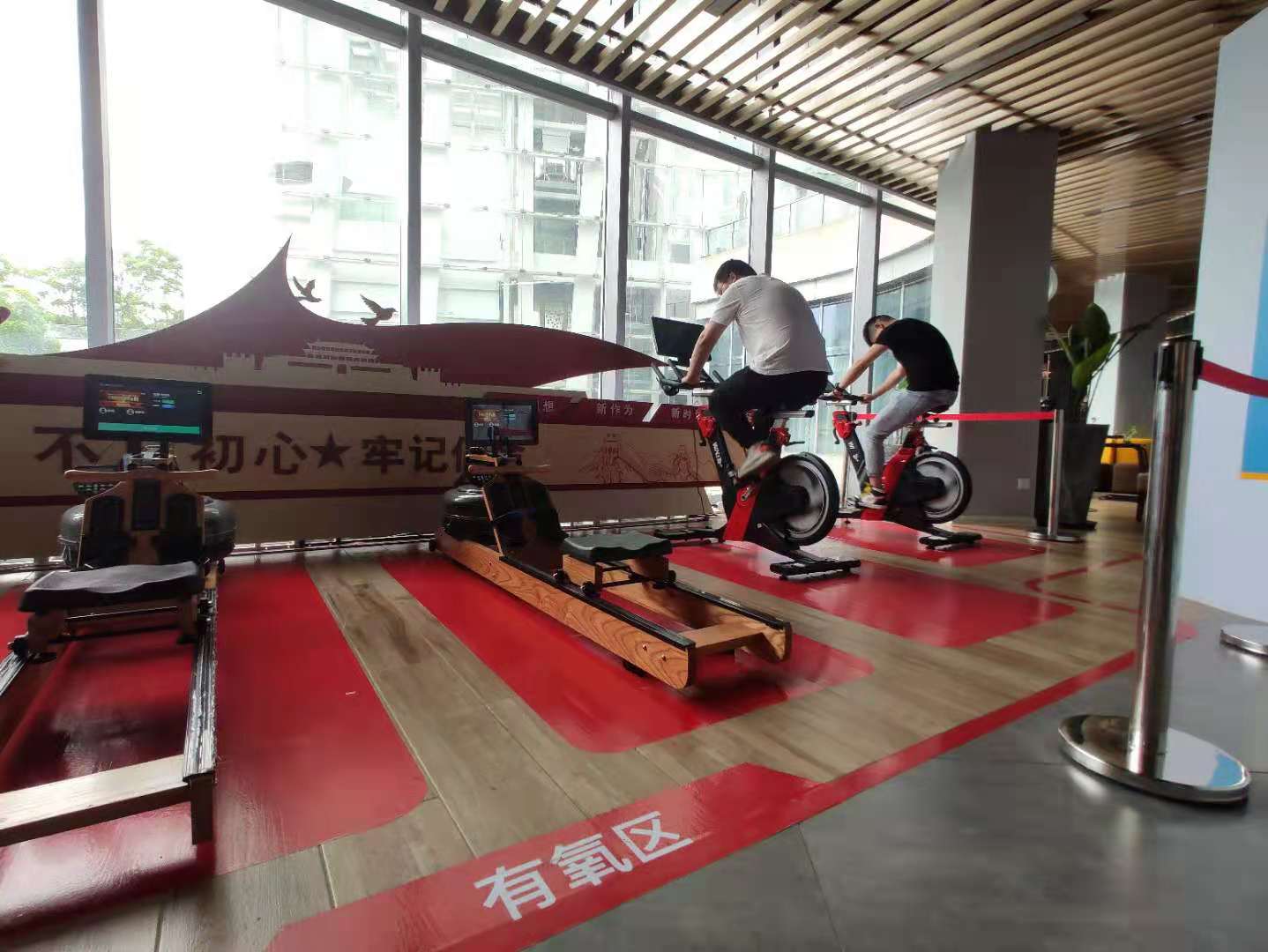 记者采访的健康服务点位于商务区玻璃艺术书局的负一层,与常见的服务点不同,这里的一排电子设备格外引人注目:一排电子设施有序排列,包括飞镖、动感单车、检测设备等,充满了科技感。其中,最令记者感到惊讶的是一款综合检测设备,记者看到,这台综合性检测设备包含了身高、体重、血压、血糖、腰围、内脂等多项功能,“多合一”的特点极大节省了空间,通过网络技术也能生成报告数据,让职工实时监控。