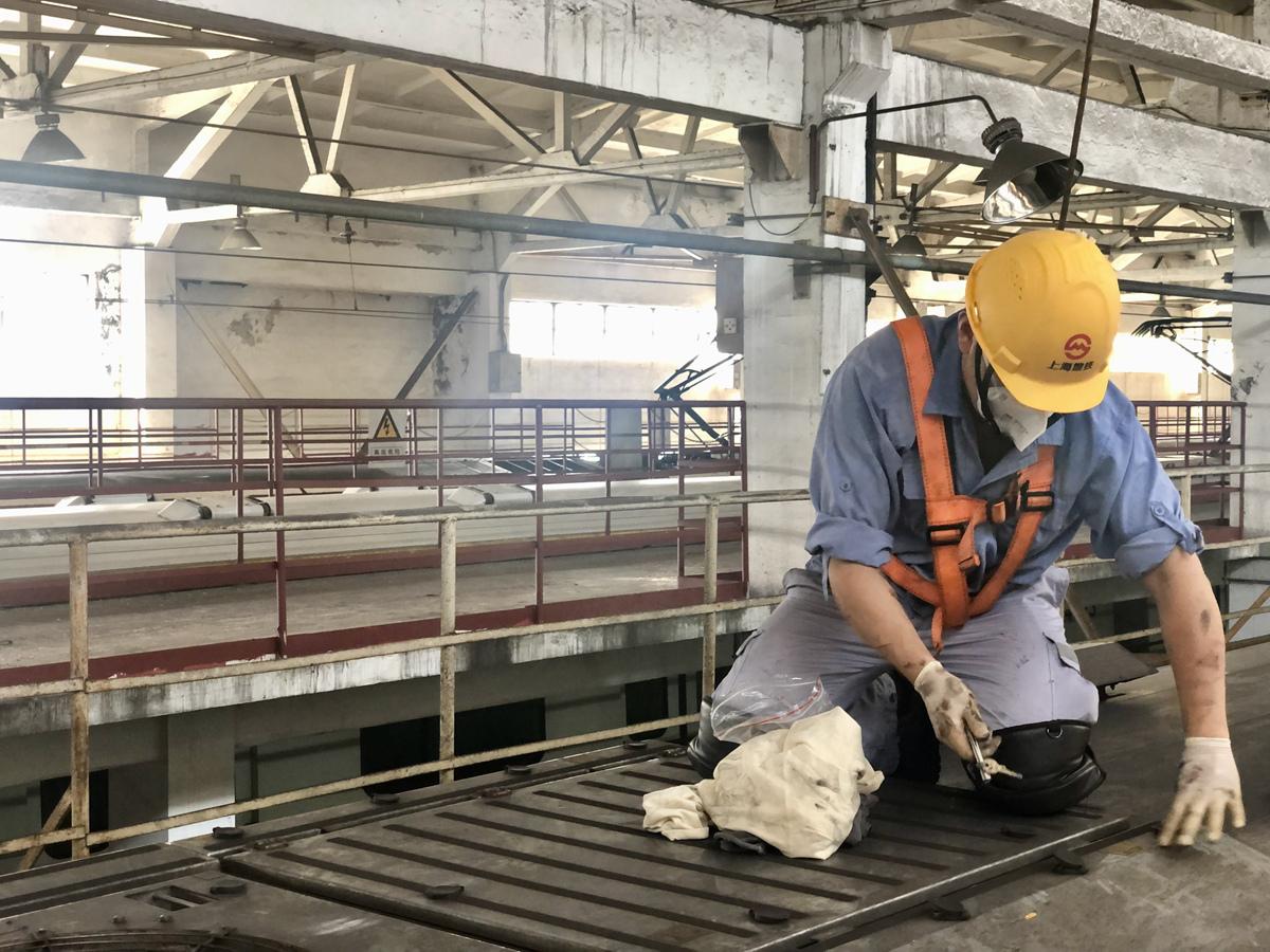记者前去采访当日,上海发出了今年的首个高温预警,当日最高温度直冲37℃。在梅陇的上海地铁维护保障有限公司里,维修一部检修七班的工作人员们正在更换工作衣,准备登上一号线的车顶,进行例行的检查和清洗工作。