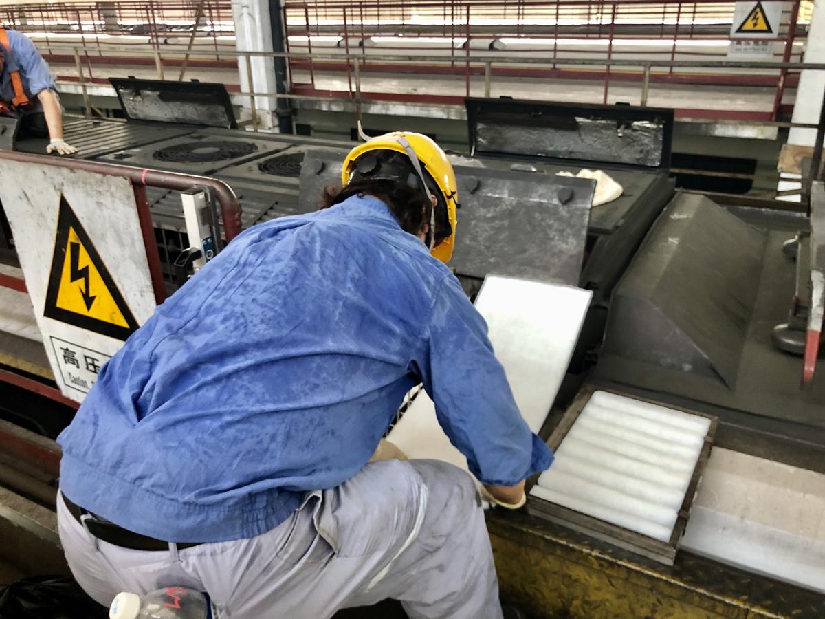 在更衣室里咕咚咕咚喝了一大口矿泉水,王峰和同事们出发了。记者也跟随他们从厂房最尽头的楼梯上登上车顶。