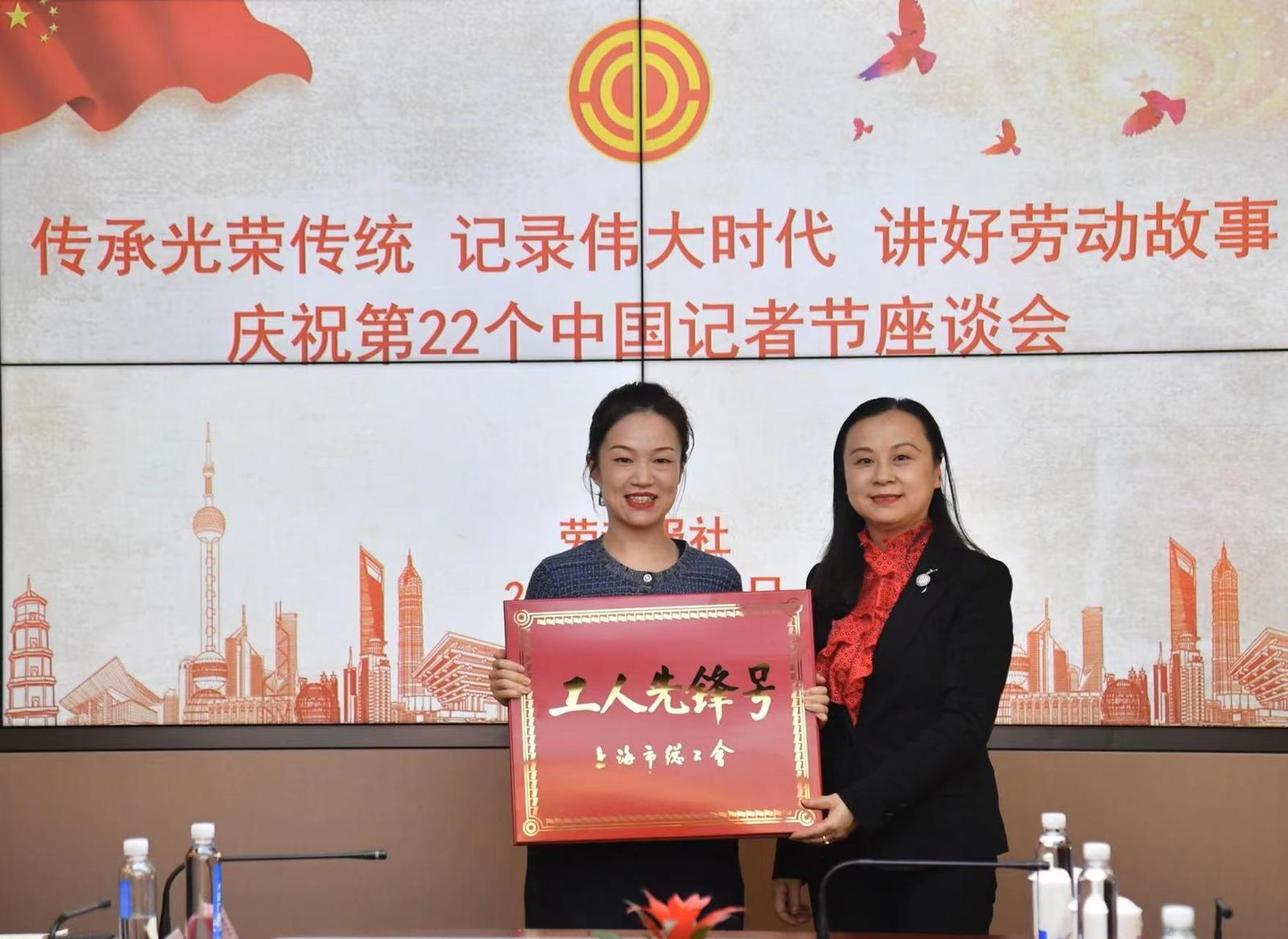 桂晓燕为获得了上海市“工人先锋号”的劳动报社编辑中心新媒体部颁发了奖牌。