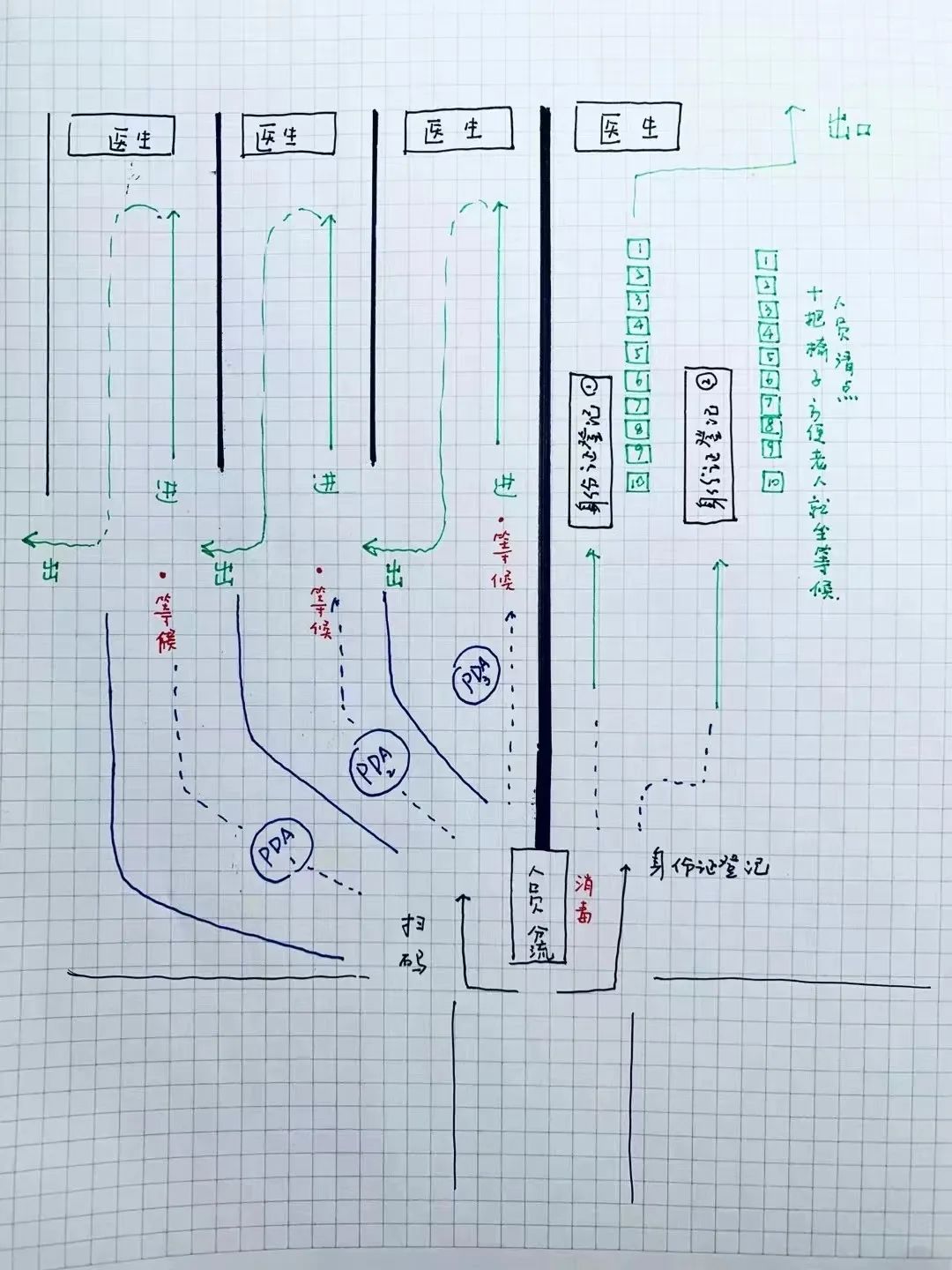 为此,人社局志愿者们集思广益,手绘出了相关的路线规划图,排队处、等候区、出入口等位置用不同颜色的笔标注得清清楚楚,根据实地情况和现场条件,每个小区都有自己的定制手绘版“作战图”。