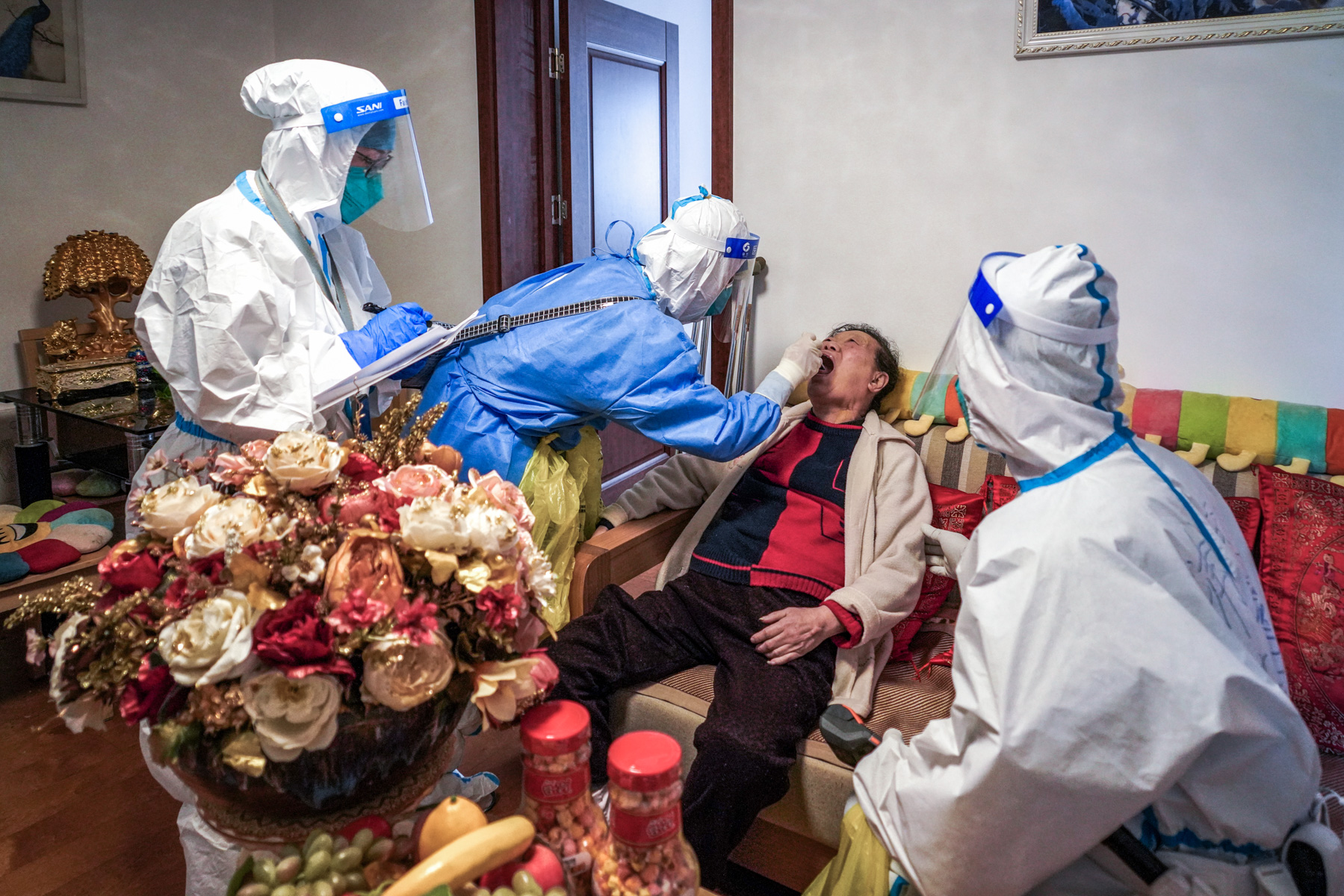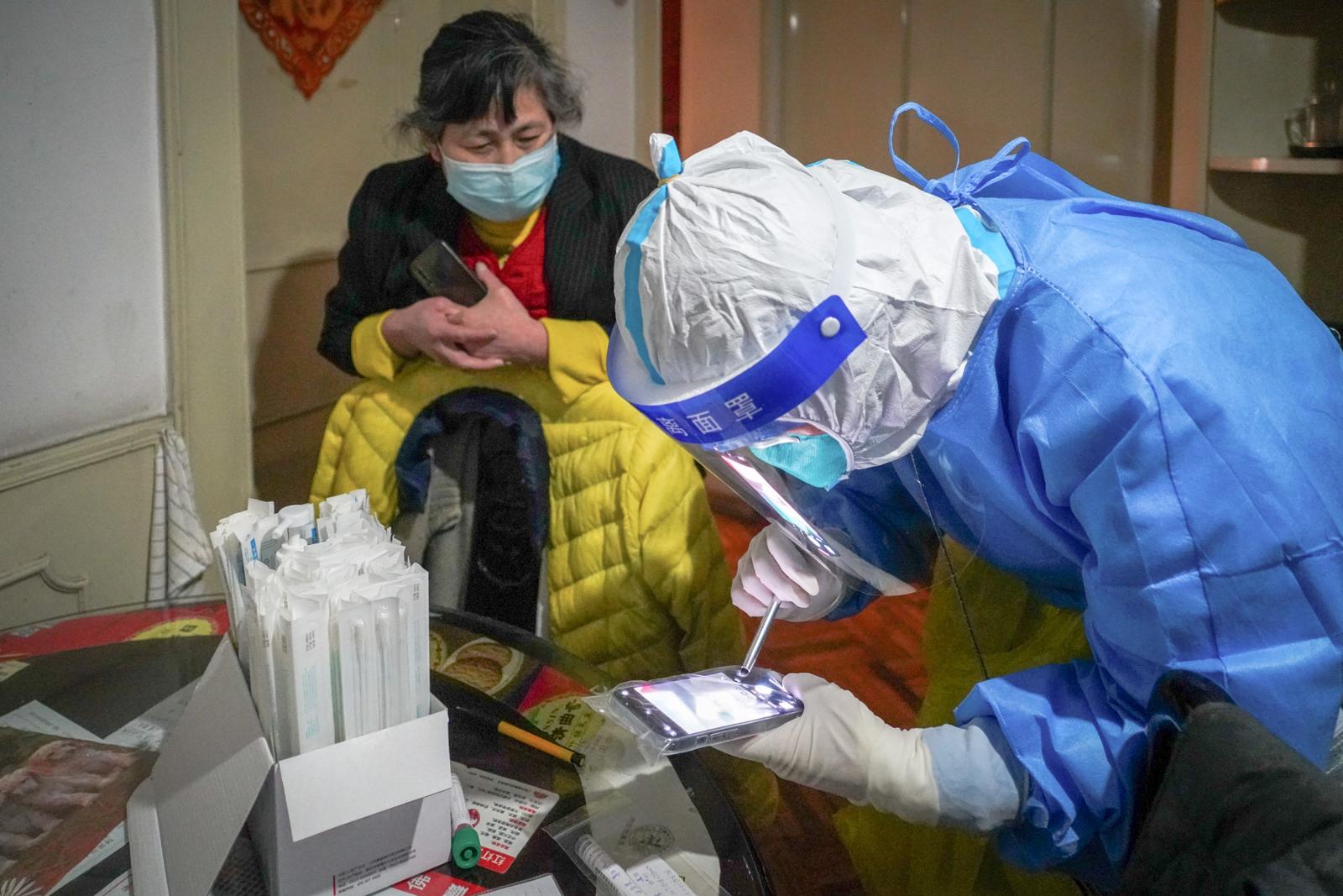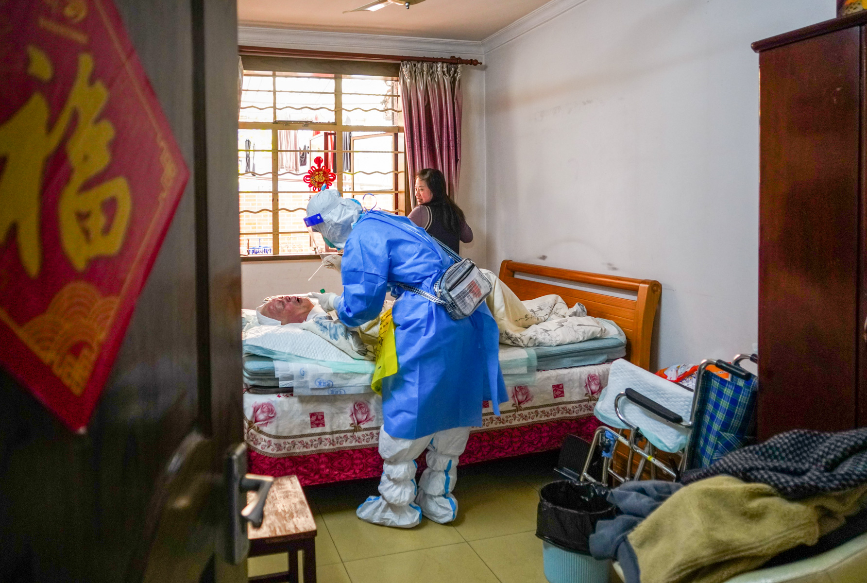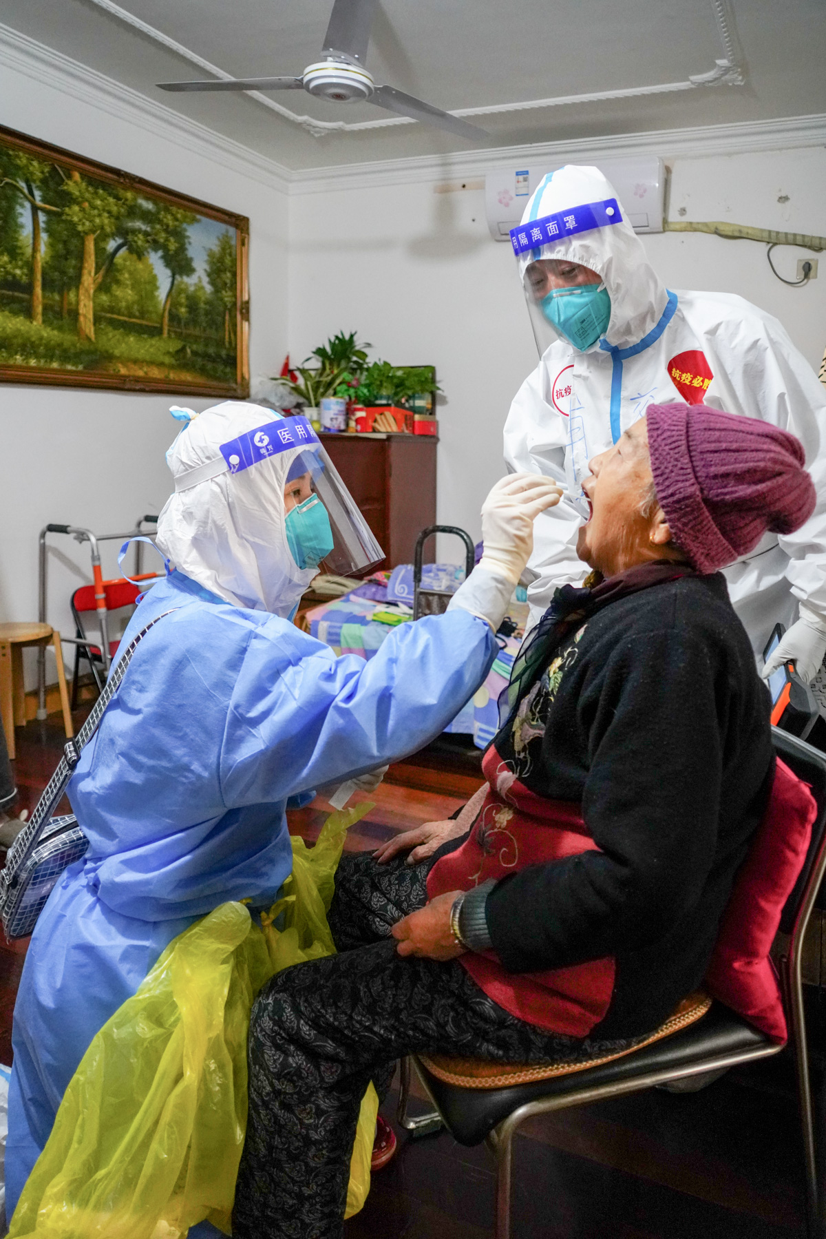 4月4日,上海市开展全市核酸筛查工作。在普陀区真光四街坊,普陀中心医院心内科护士长李敏为行动不便的老人上门做核酸。采样过程中,李敏或蹲、或弯腰趴下,小心细致为老人采样。(摄影/孙瑞英)