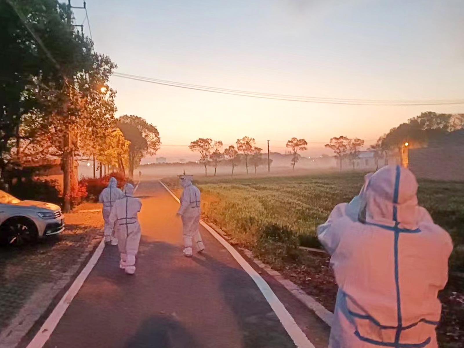 4月4日清晨4点,闵行区浦江镇镇北村的志愿者们出发上岗,迎接新一天的任务,美丽的日出下,他们整装待发。(摄影:黄佳伟,梁丹琪)