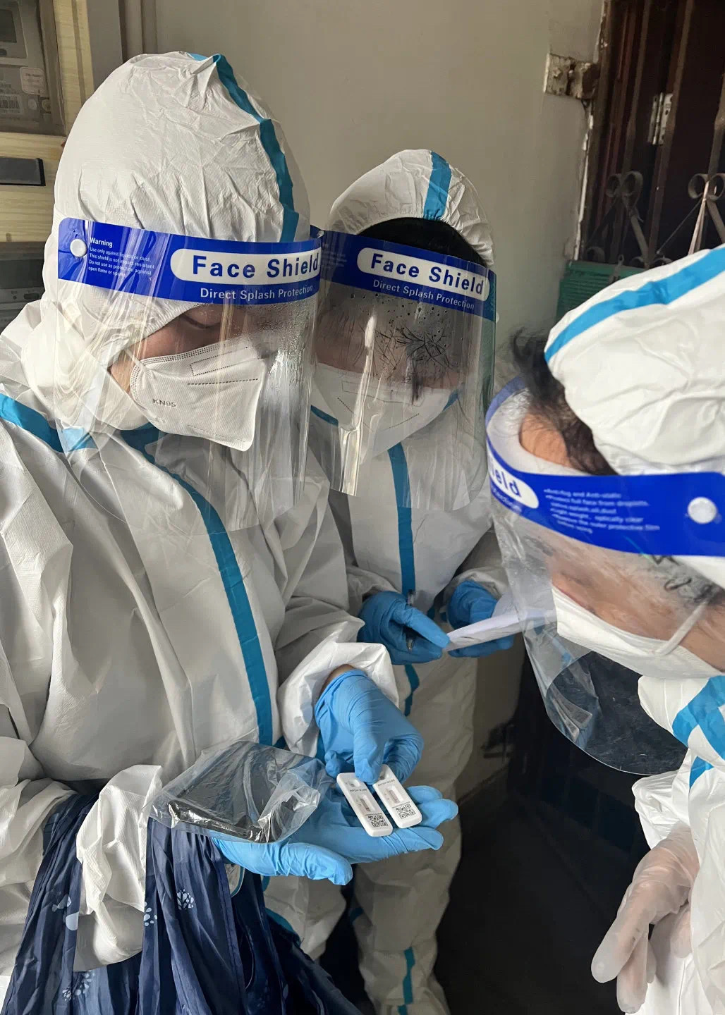 因为有过一次分发的经验,工会志愿者们一到现场立即争分夺秒开展分装工作。小小一个抗原自测材料包涉及测试盒、拭子、采样管、说明书、检测卡、棉签、回收袋等多项小件,分装必须迅速而又仔细,不能遗漏。大家分工协作、仔细包装,确保在最短的时间内做好抗原材料包的分装工作,为后续的登门发放争取了时间。随后,11名志愿者分成3组,按照居委会提供的名单,快速高效地为3个小区发放抗原自测材料,仅用了2个小时即完成1800余份抗原自测材料的派发工作。