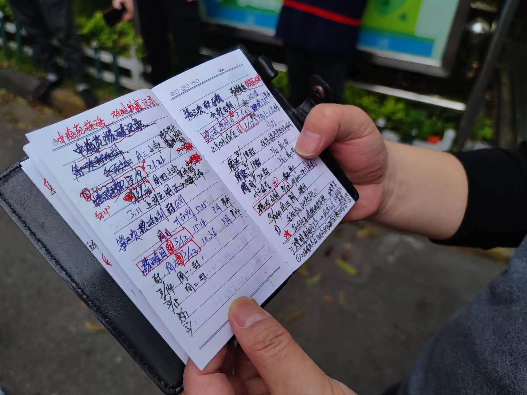 记者见到杜冠卿时,他一边翻阅着手上的记事本,一边和记者讲述了小区封控一个多月来的历程,这本写得密密麻麻的记事本,记录了他这一个多月来的点点滴滴。