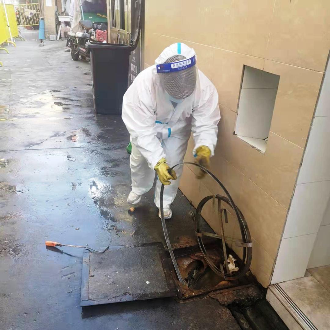 4月2日晚5点左右,临平路30弄后私房边的公共厕所堵塞,当时辖区里已有确诊病例,但志愿者和保安保洁等防疫工作人员需要使用这个公共场所,于是居民区书记向宏阳物业公司进行报修。公司工程部副经理赵建岗立刻做好个人防护措施,带上工人一起过去帮助疏通解决。