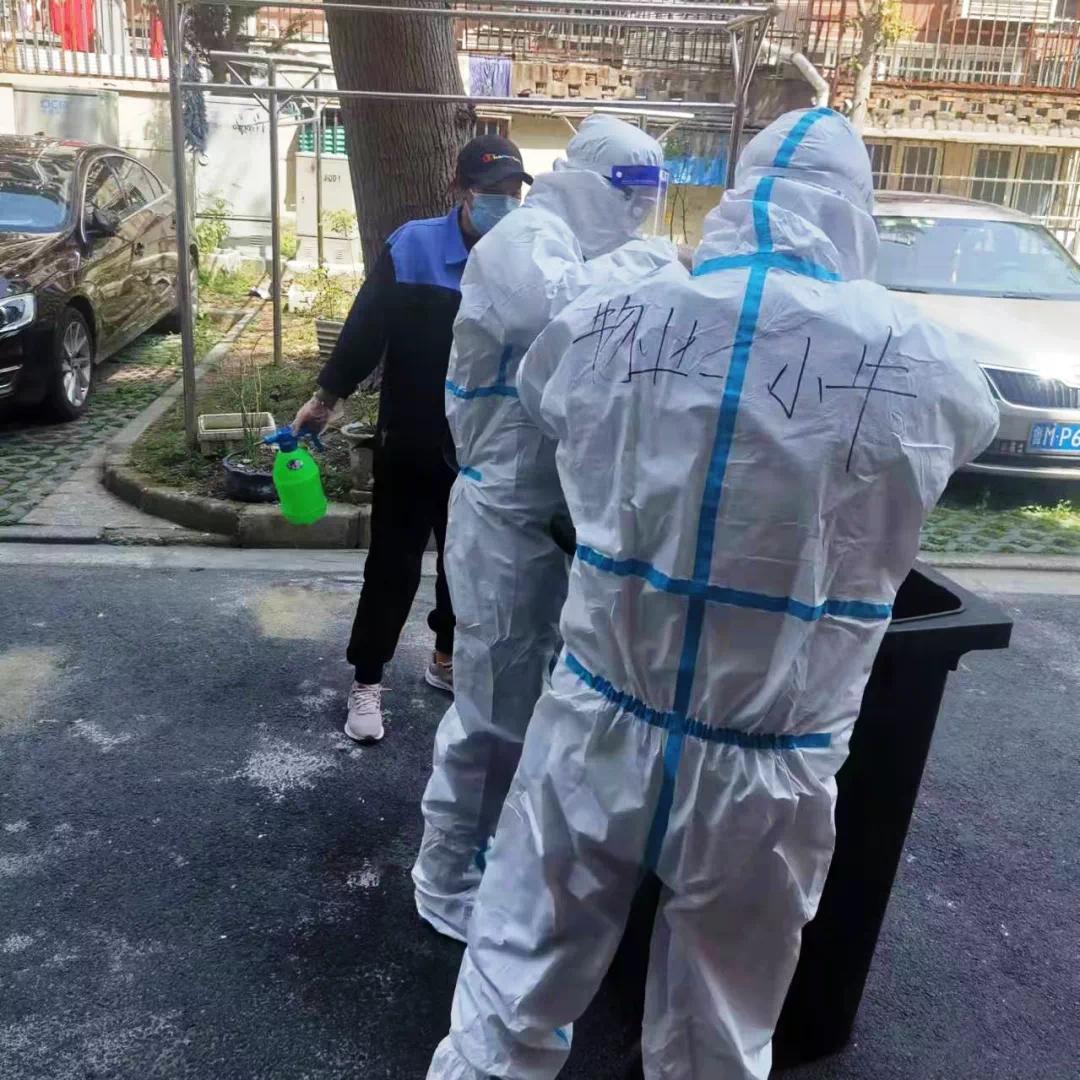 4月7日一早,小区经理吴珏和牛燮铭就穿上“大白”进行个人防护工作。原来,公司所辖北郊小区有确诊,收垃圾和消毒工作量突增,为保障小区清洁与安全,他俩亲自上阵,支援保洁工作。