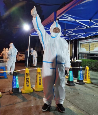●上海市先进工作者桂凤雷(上海市松江区市容环境卫生管理中心党支部委员、副主任)带领志愿者突击队坚守核酸检测点位↓