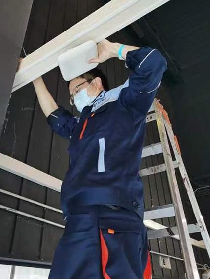 医务人员告诉徐小锋,护士台区域网络不稳定。徐小锋检测后发现,WiFi网络连接正常,是设置上出了问题,熟练地更改设置,切换信道,很快这个问题就解决了。伴随着两位同事也入住足迹馆方舱,徐小锋张罗起三人一同将舱内3层楼每个点位的WiFi都重新测试一遍。有时,他们还和舱外的同事联动,共同完成布线任务:同事在舱外完成工作后,将需要接入舱内的线路扔进舱内,再由他们完成舱内的通信保障。