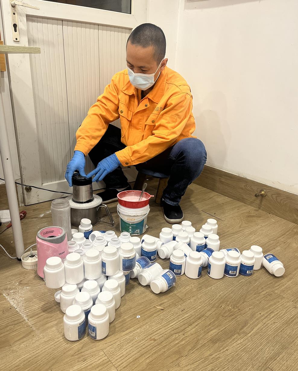 “我们消毒用的泡腾片,至少15分钟才能溶解,太耽误时间了。”为了减少志愿者工作时溶解泡腾片的等待时间,每晚,徐元平会将泡腾片带回家,用家里的搅拌机磨成粉末状,一天需要100瓶,一瓶100片,这一万片磨完,至少需要两个小时。