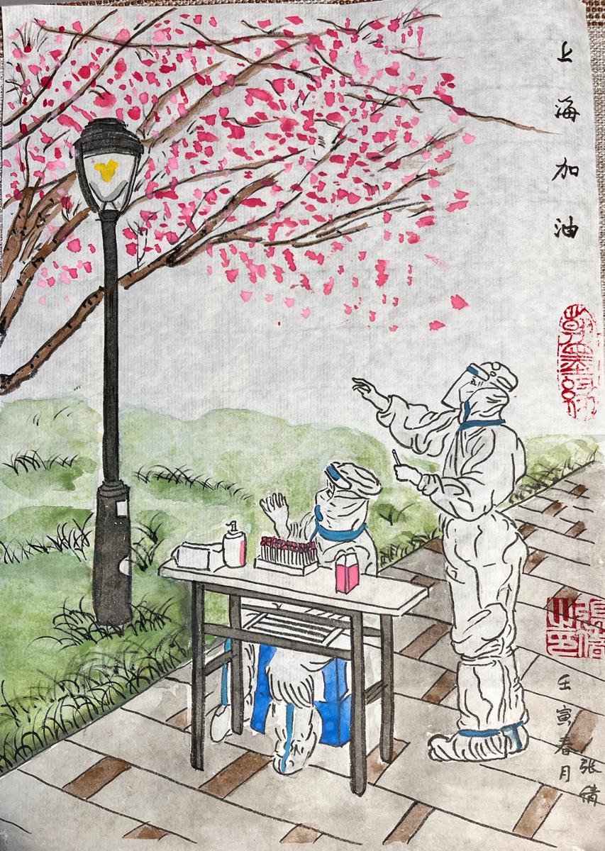 来自上汽通用汽车金融的张倩这次投稿了一副名为《樱你而美》的作品。这幅作品灵感来源于一张被刷屏的暖心照片,两位来自南京的“大白”驰援上海,夜晚在小区樱花树下为居民做着核酸。张倩告诉记者,当时每天看到上涨的病例数据,关于物资关于医疗的,心里总是揪着。那天晚上,她看到了这张照片,心里顿时觉得被抚慰了,“可能是紧张的情绪得到了缓解,我心里特别触动。”