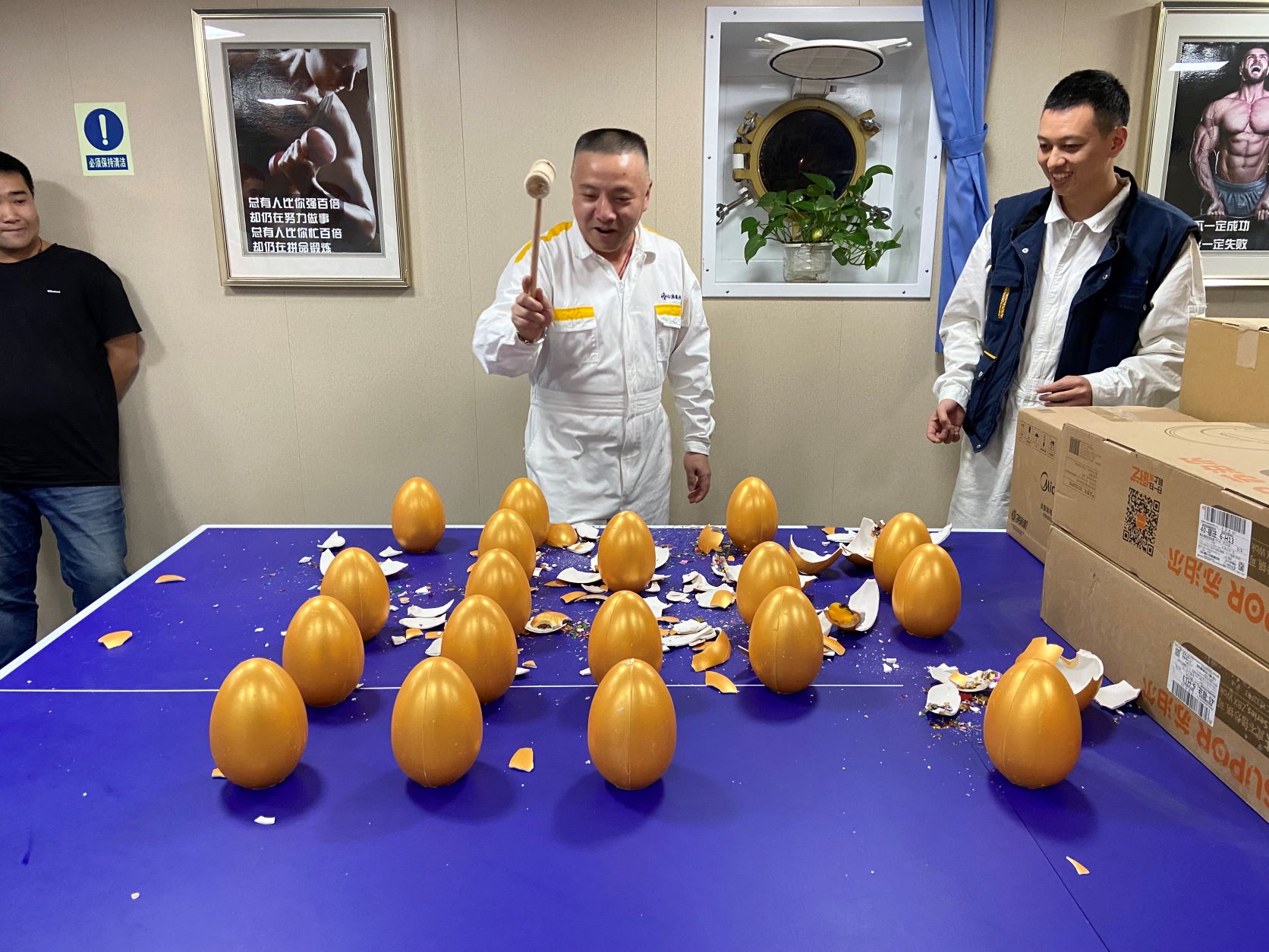 为了缓解大家的心理压力,活跃船员气氛,船舶党支部联合工会开展“温暖五一·情暖航浚6008”主题活动,活动中设置“砸金蛋”环节,全员根据抽签号码依次排队进行,大家摩拳擦掌跃跃欲试,伴随着金粉四溅及金蛋清脆的破碎声,船员们不但收获了喜欢的奖品,心理压力在欢声笑语中也得到了极大的释放。