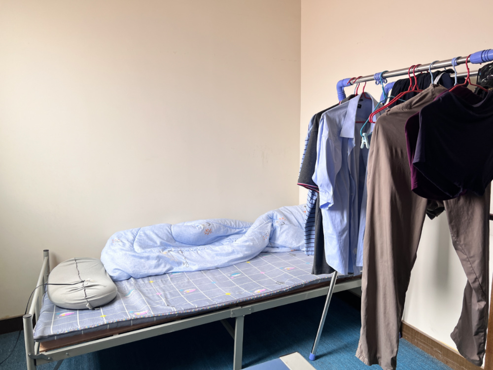 停摆两个月,虹口212地块旧改工作重又启动,刁海峰月初就带领30名征收人员驻扎进了基地,一待便是一个月,端午节也没休息。基地监控室不到10平方米的空间,就成了刁海峰的“蜗居”。简陋的单人钢丝床上,铺着的被子总是顾不上叠。为了随时“在线”接待居民,不止刁海峰一人,不能外卖、排队洗澡、睡行军床……征收人员们都不断克服着封闭管理中的诸多不便。