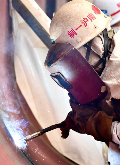 颜鲁梅一边说,一边从焊机上截取一段焊丝,用尖嘴钳装入焊枪,随后戴上防紫外线眼镜,抄起电焊面罩,根据钢板情况调整好电焊机参数,便蹲下身从下往上依次焊接起钢板。耀眼的白色焊花随着焊枪舞动而四处飞溅,一股呛人的烟火味裹挟着热浪一起朝记者袭来。“焊接电流越大,钢板熔融速度越快,工作速度当然快,但是双燃料VLGC所用的钢板比较特殊,如果使用‘猛火快炒’钢板就会变脆,导致其直接报废,只能使用‘小火慢炖’慢慢焊接,还要特别注意电流、电压以及速度的配比,快不得。”