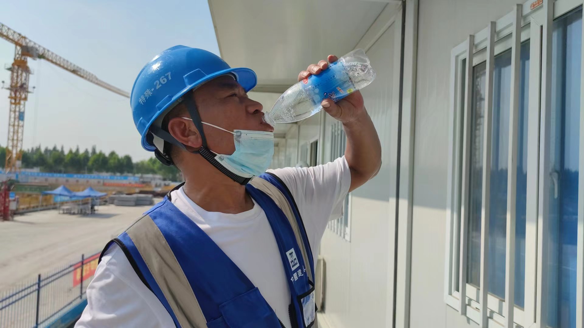 日光渐盛,时间来到上午10点,这也是张永每天中午休息的时间,如今,项目部采取“做两头、休中间”的工作作息,避开了最热的中午时段。在项目上,也设置了凉亭,供有需要的工人饮水、休息,在一些地方,还安装了洒水喷雾等,给现场降温。该项目工会主席葛巧治告诉记者,这些都得益于目前项目推行的实名制系统和此前市总工会的扫码入会工作,对项目上的工作人员有了更详细的掌握,工会也在做好服务保障的基础上,备好盐汽水、人丹、清凉油等物资,让职工们既做到人手均有,也做到随取随用。