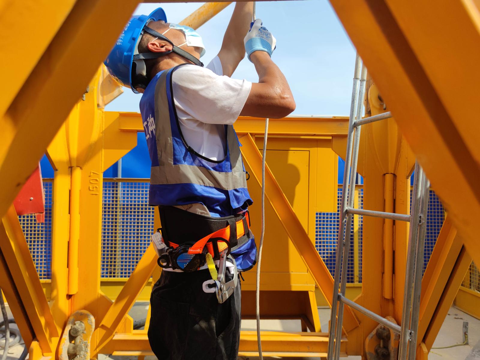 高温的“烤”验,从攀爬开始,在张永到驾驶室之前,需将安全锁扣扣在规定的位置,并挂好防坠器,在他下拉绳索的过程中,记者能很清晰地看到有汗滴挂在他的手臂上。而他攀爬的梯子,也是金属制成,隔着手套等衣物仍能感受到“烫手”。27米的塔吊,张永仅用几分钟就攀爬到顶,但这份沉稳并不是与生俱来,“做久了肯定适应了,但第一次第二次的时候肯定有害怕,所以防滑手套、防滑鞋这些更不能少。”