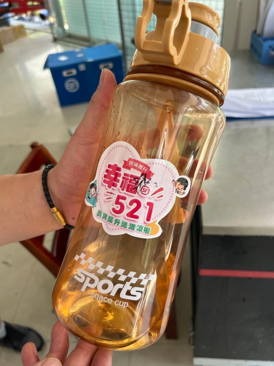 付文光和刘俊川也是刚刚结束工作,戴着冰袖的付文光,擦了擦脸上的汗,拿起身边的水杯咚咚地喝了起来。这样大容量的水杯是顺丰工会发放给每一位小哥的,“一开始我们都喝那种矿泉水瓶,一会就没了,还得折回去拿,挺麻烦的。后来公司就给我们配了这种800毫升的大水杯。”付表示,在上海这样的天气底下,就算是800毫升的大杯,他们每天都要喝上三到四瓶,出汗量实在太大了。