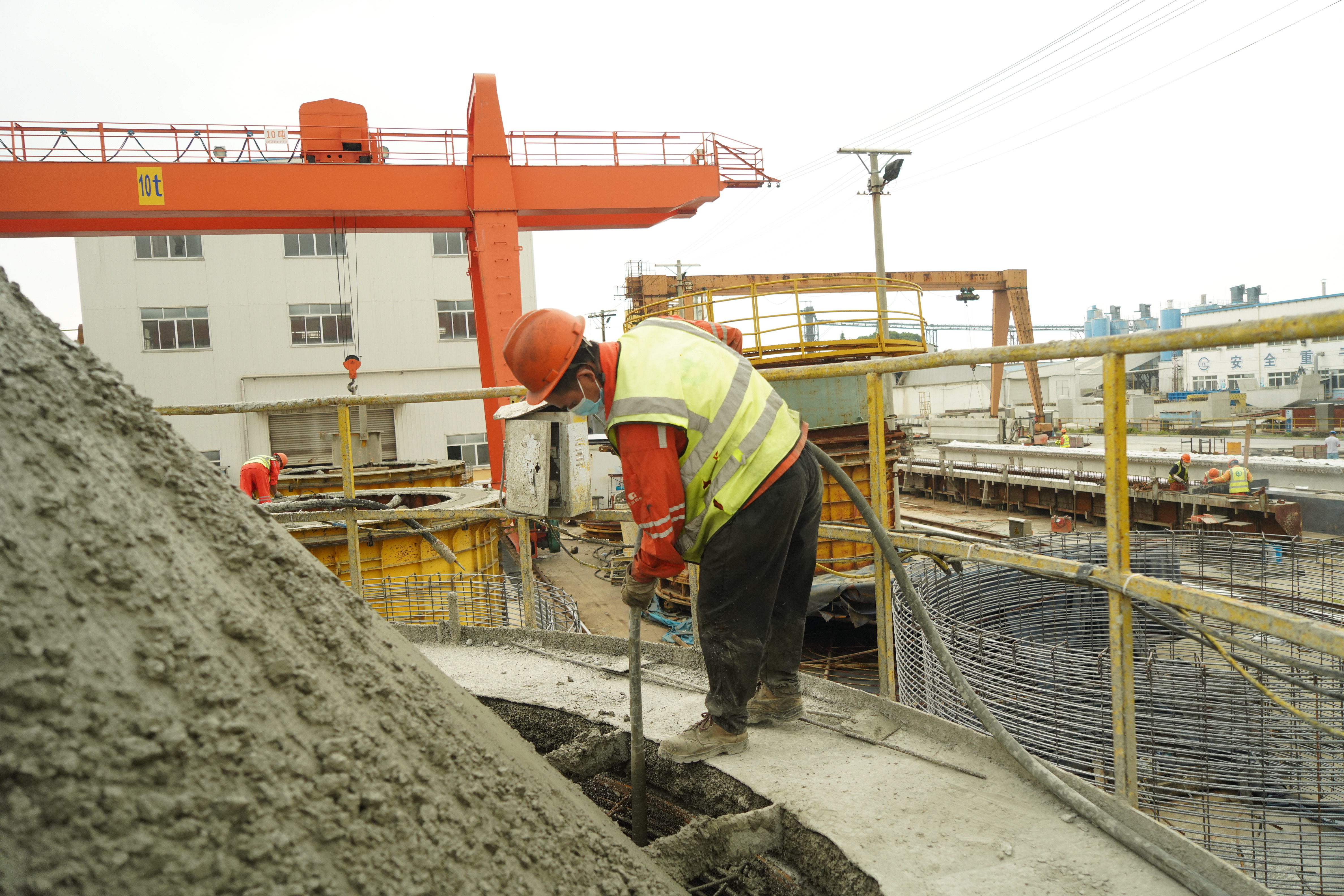 在一个目测高约3米的圆柱形钢模上,来自四川的张平武和杨成法正忙碌个不停。在钢模的内外模中间,正摆放着此前环节加工好的“骨架”。搅拌好的混凝土,将通过将军帽均匀浇筑在钢筋骨架之间,而两人要做的,就是手持一根20斤重的振捣棒,不断将内部松散的混凝土振捣紧实。虽然震动由机器的动力提供,但是强烈的阳光下手持重物工作,汗水还是很快就从两人的脸上滴下。