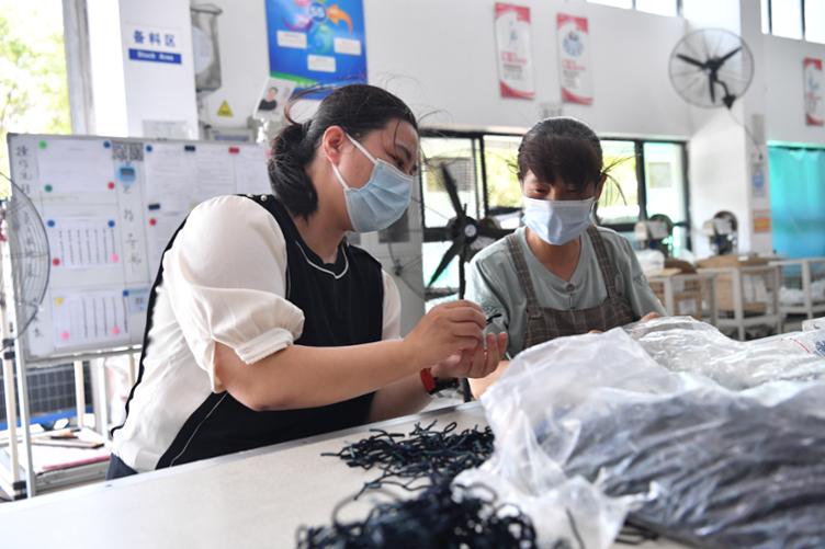 穿过被风扇声和缝纫机声填满的车间,陶颖来到一张堆满材料的长桌前坐下,而她的“师父”,厂里工龄7年的纺织女工卜乐云正在熟练装配半成品拉链。