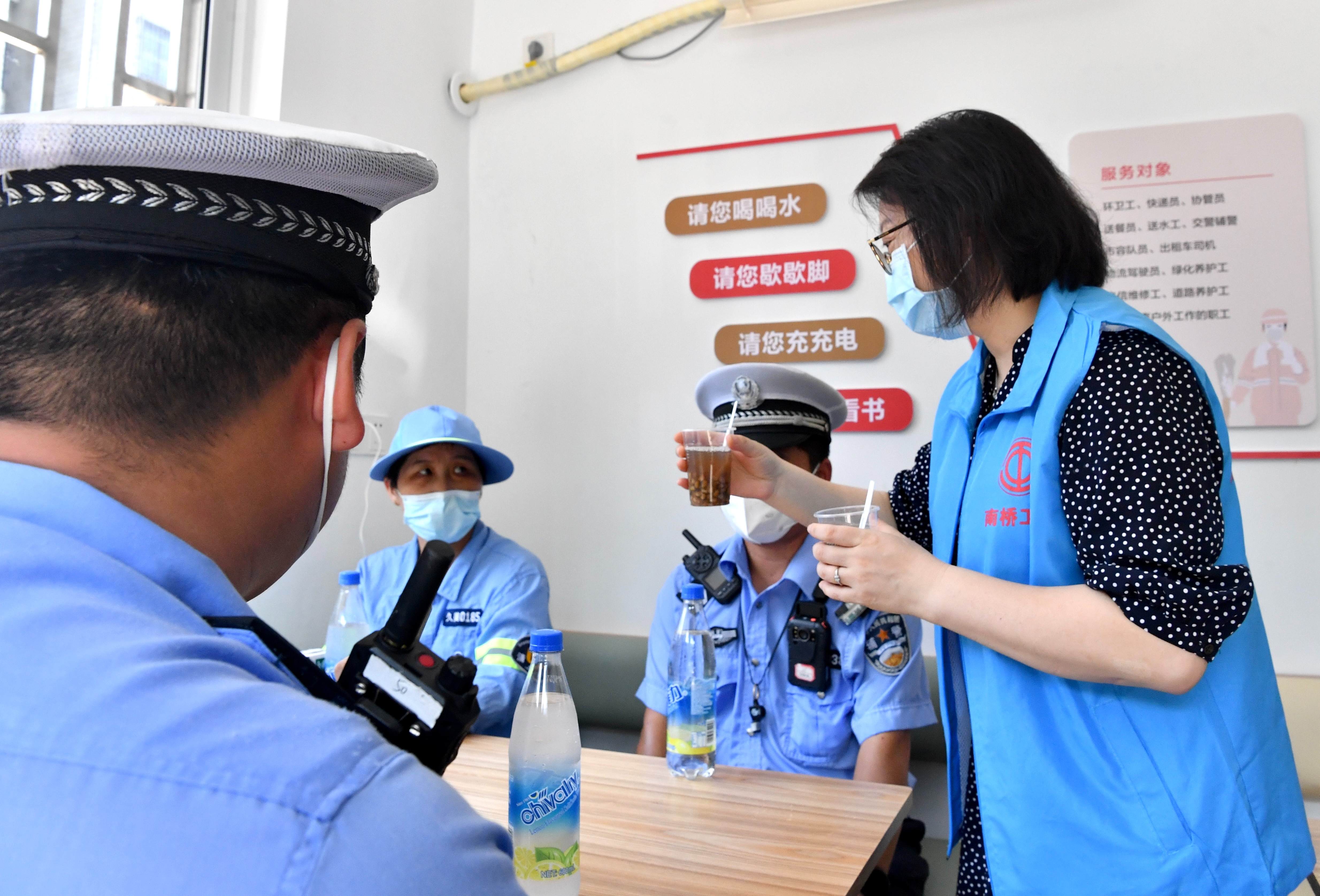 第一个推门进来的是一位清洁工阿姨,看到整修一新的休息站,她有些诧异,进来后,她坐在椅子上用草帽不停地扇风解热,略显拘束。不一会儿,与她同个班次的清洁工也纷纷进来乘凉。邵丹华从冰箱里拿了盐汽水和牛奶递给他们,并告诉他们自己是今天的站长,希望可以了解一下他们的需求和建议。