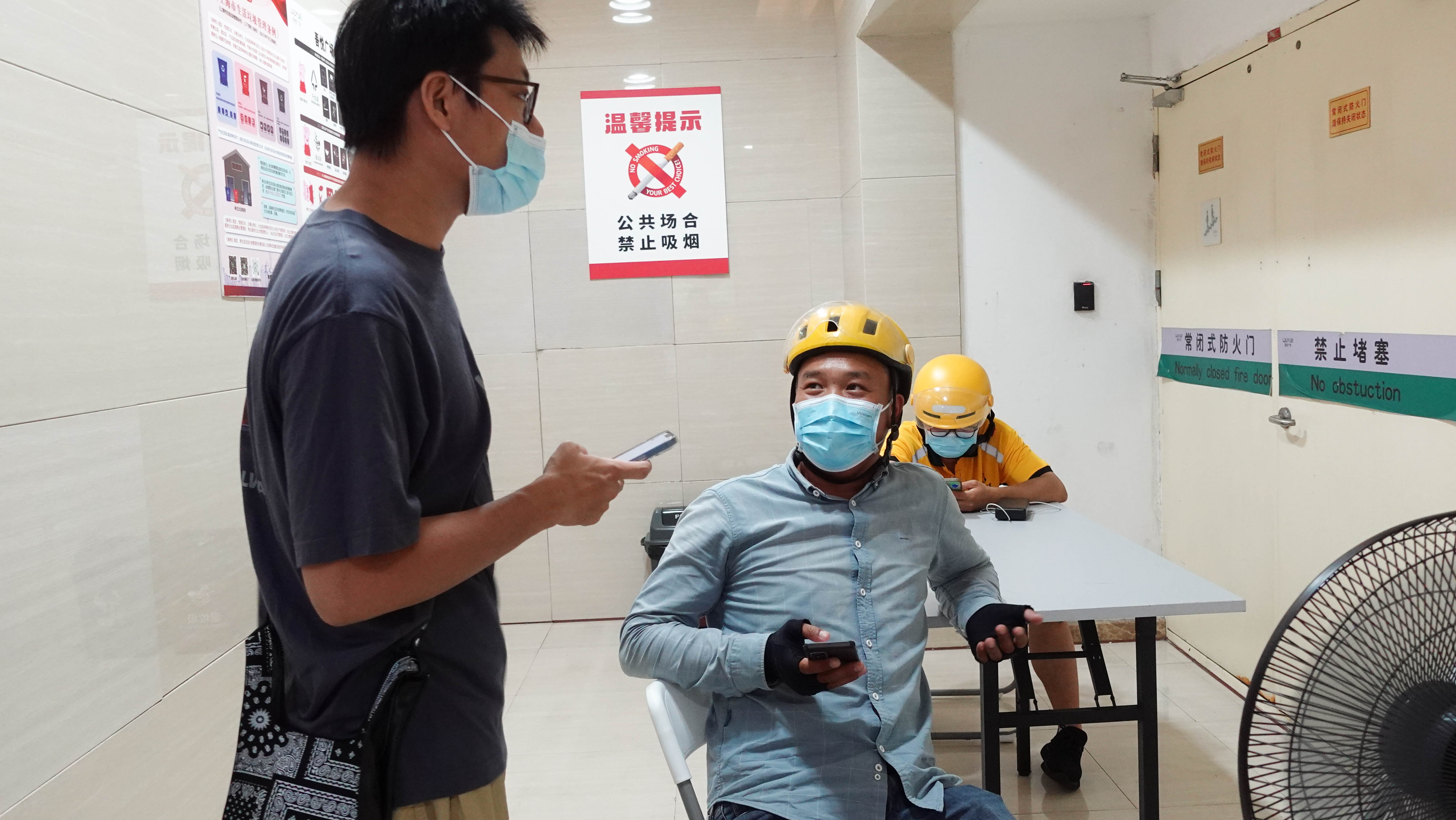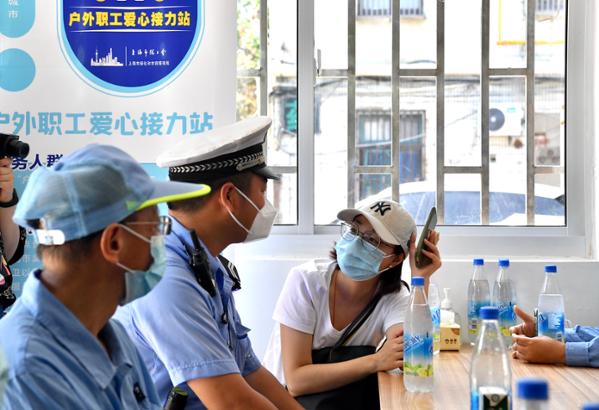 劳动报记者陈恒杨采访奉贤区南桥镇户外职工接力点。■摄影 贡俊祺