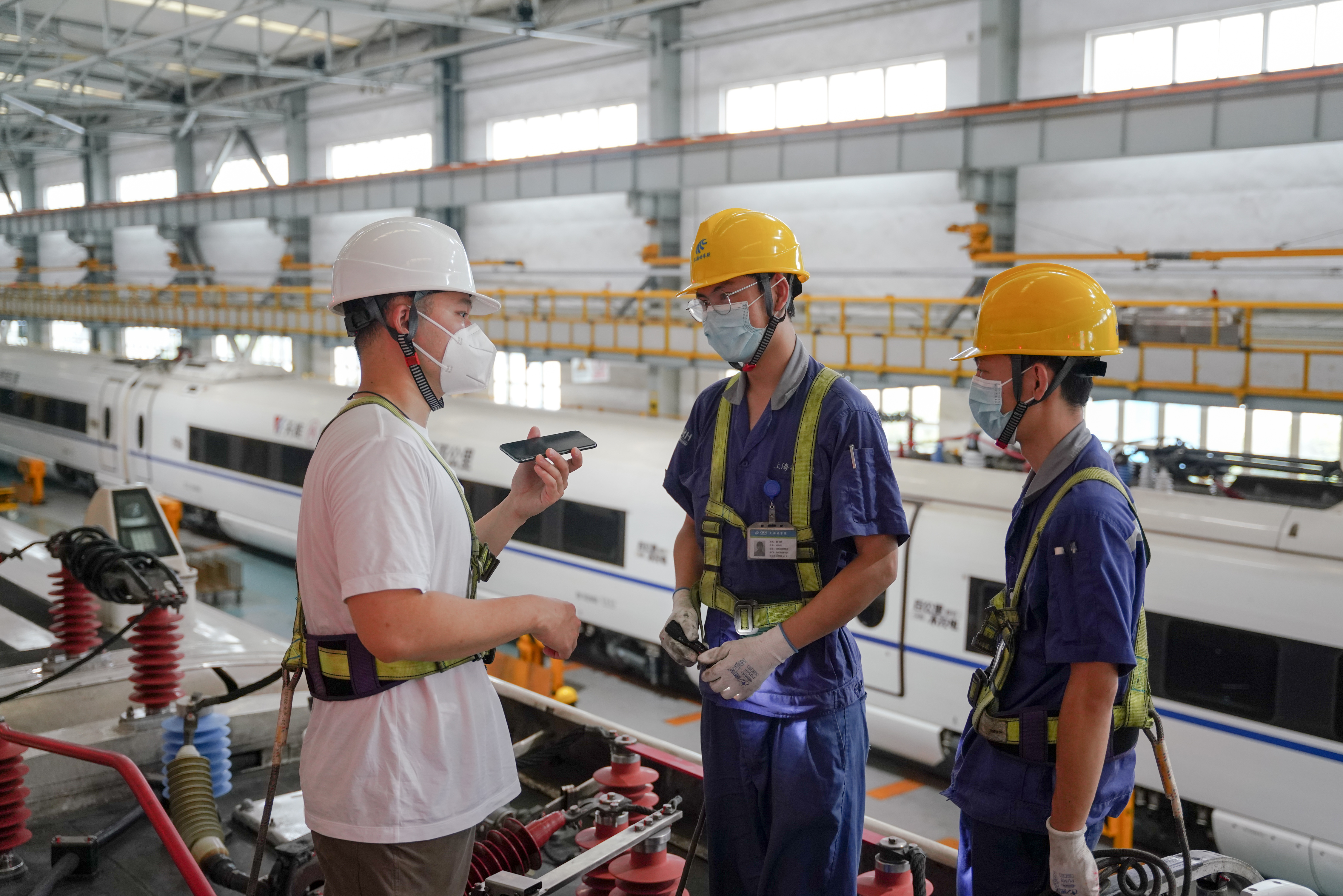 劳动报记者柴一森跟随虹桥动车运用所的检修员们体验车顶检修工作。■摄影 刘振思