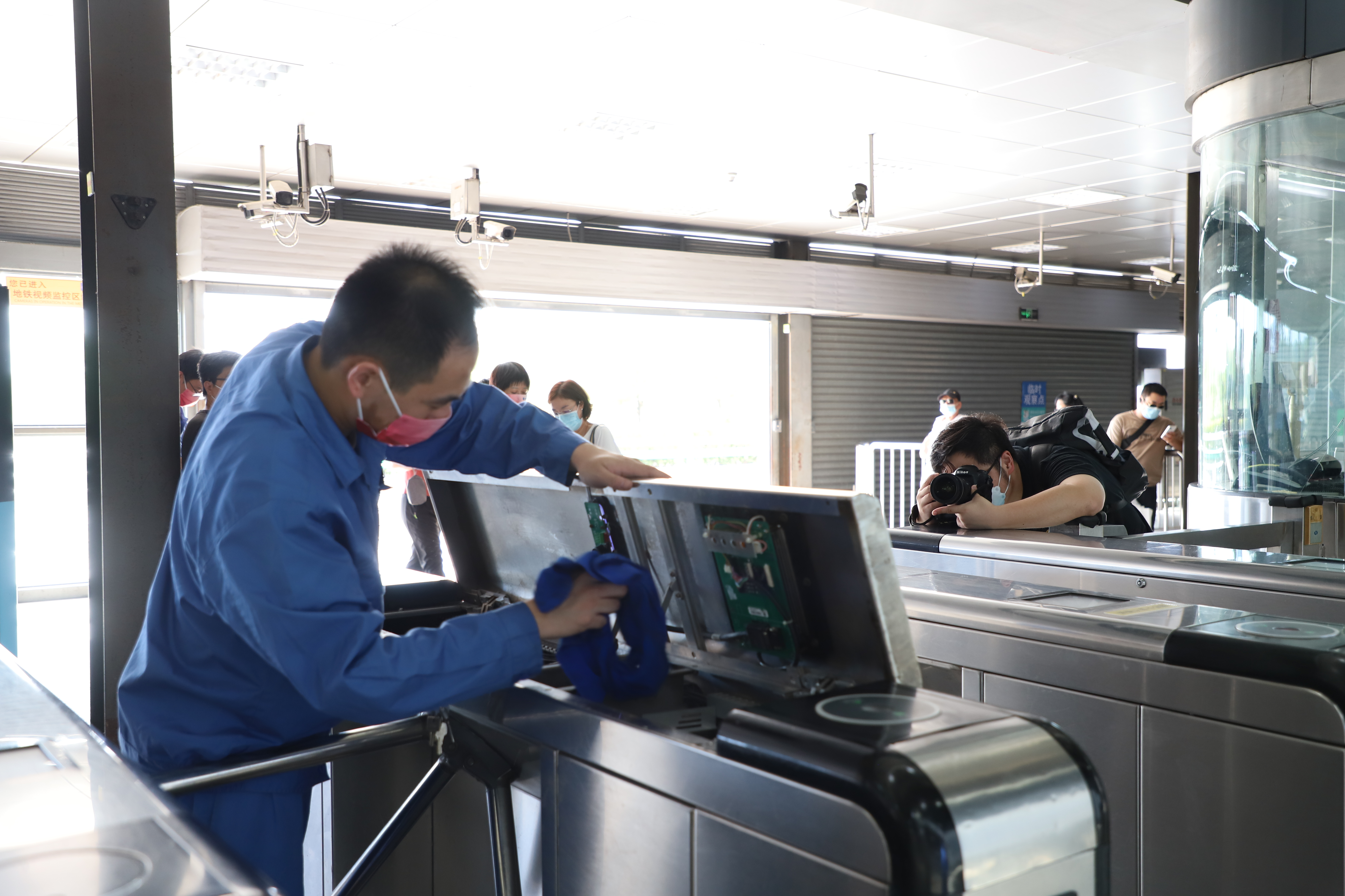 劳动报摄影记者展翔拍摄在室外站台下保养地铁闸机的华虹计通公司职工。■摄影 凌睿