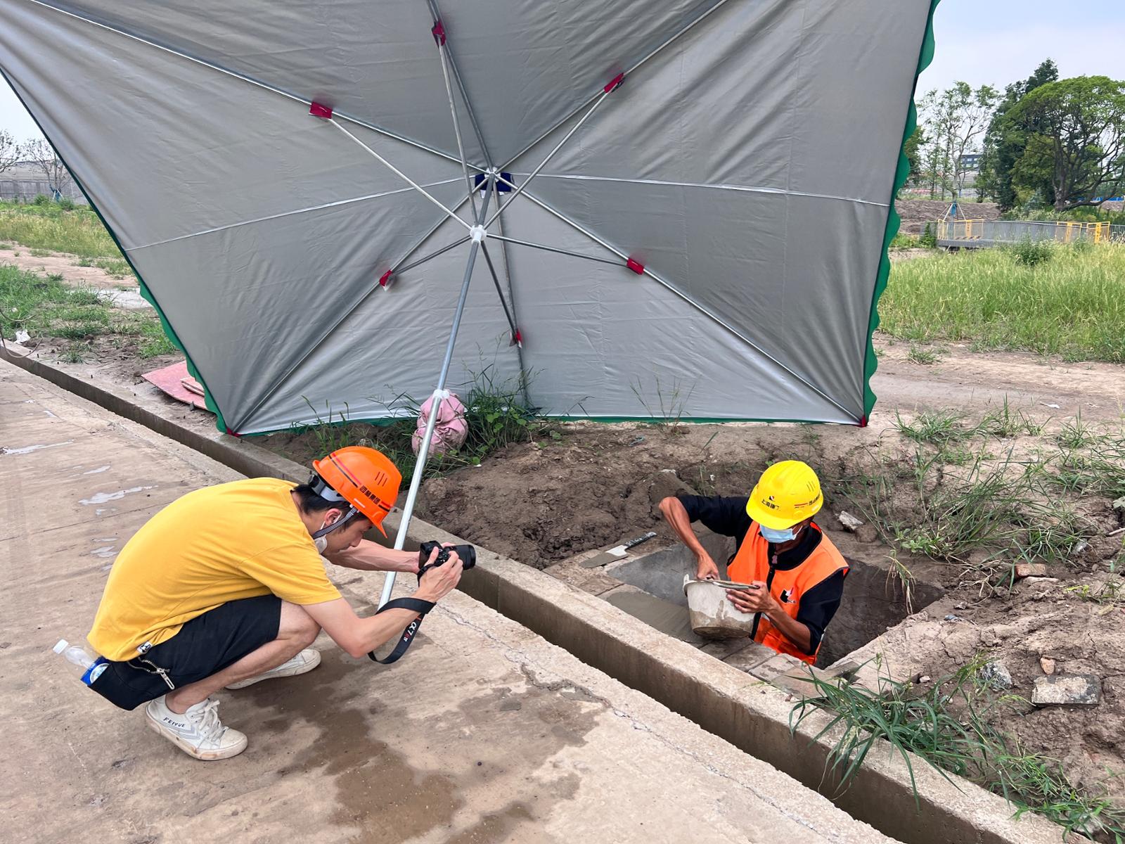 劳动报摄影记者贡俊祺俯身拍摄战高温建设“上海大花园”的强电井砌筑工。■摄影 李佳敏