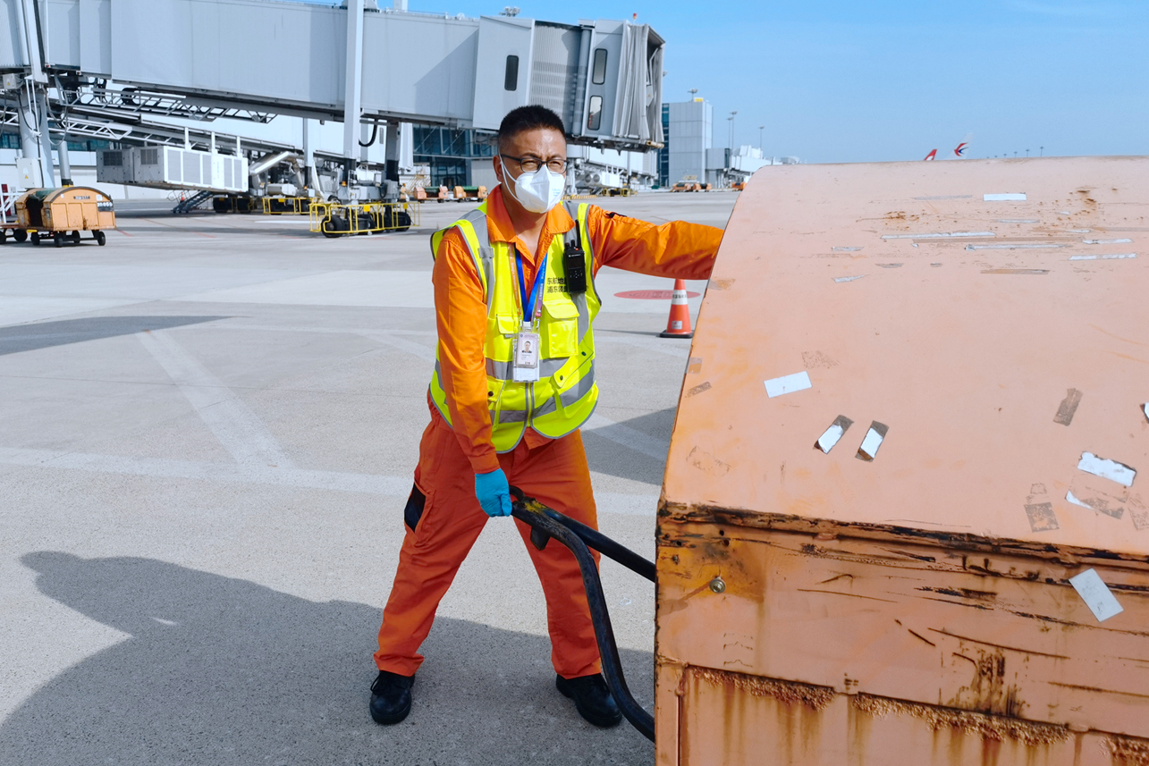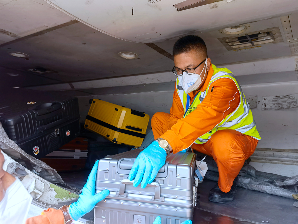 除了客机,金志敏还要负责国际进出港货机的装卸工作。不同的是,他们要穿上密不透风的“大白”。有时装卸几件“大家伙”就要花费3个多小时。“毫不夸张地说,脱下防护后,全身的衣裤都能拧出水来。”老金说。