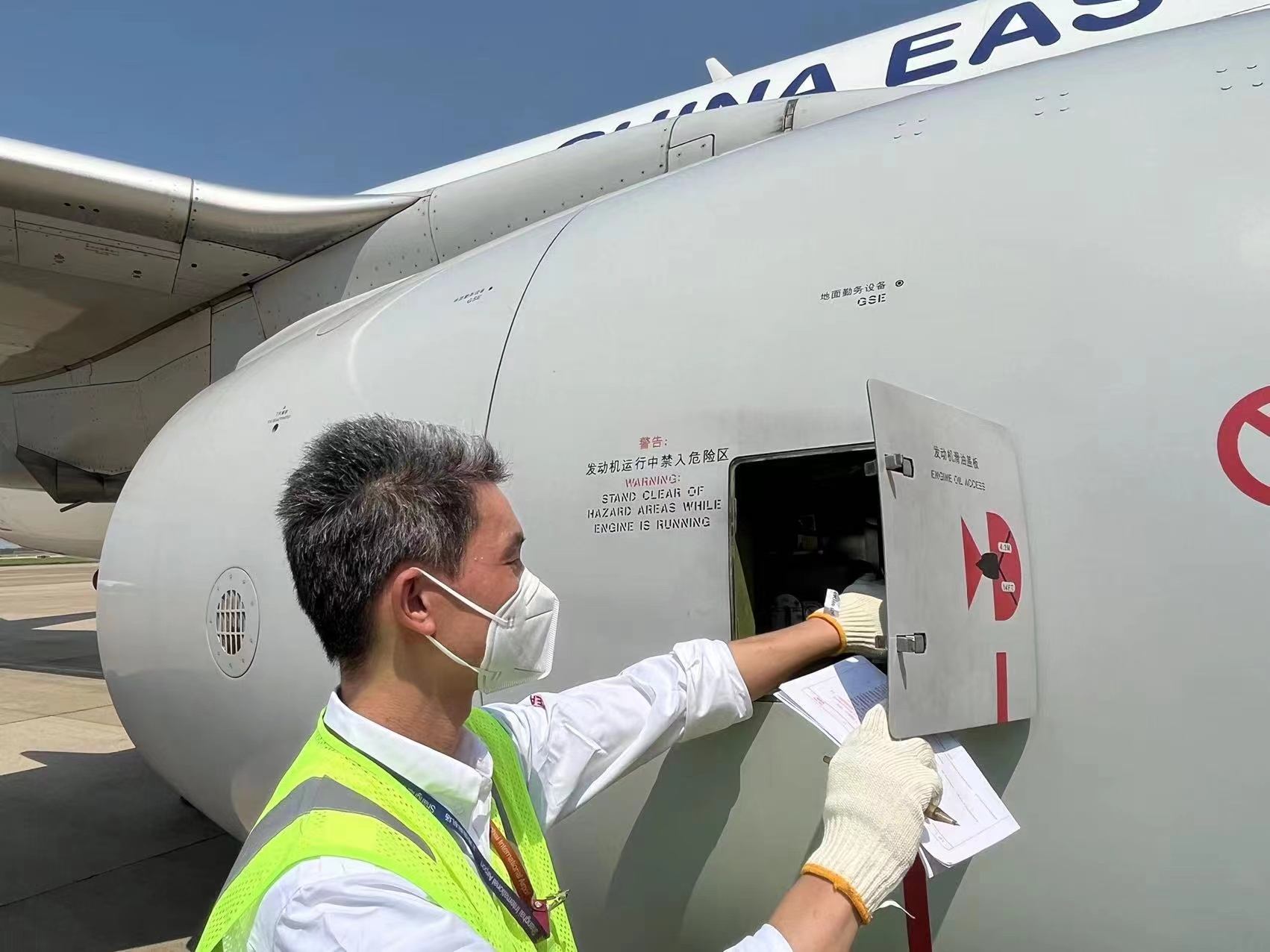 “戴着这个才叫考验”,老张指了指脸上的口罩说,由于机场防疫规定,机坪作业必须佩戴N95口罩,这让高温下的维修工作变得更加困难。“一个小时就得换新的,因为湿掉之后就没法透气了。”