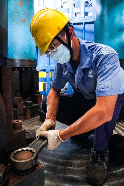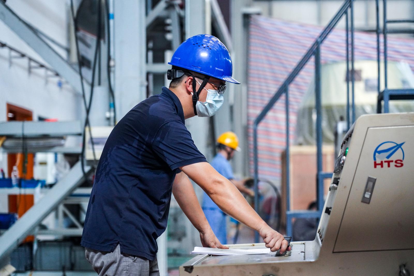 “每个支点需要多大的力都是由技术人员来计算。”作为一名技能人员,金立群要做的就是与技术人员打配合战,双双协作想办法。离金立群几步之远,拿着图纸与工人们热烈讨论的正是这项火箭发动机机架的试验主管孙自强,虽是作为高学历人才招聘的技术员,他却也戴着沾满油污的手套,蹲在现场钻在设备前。