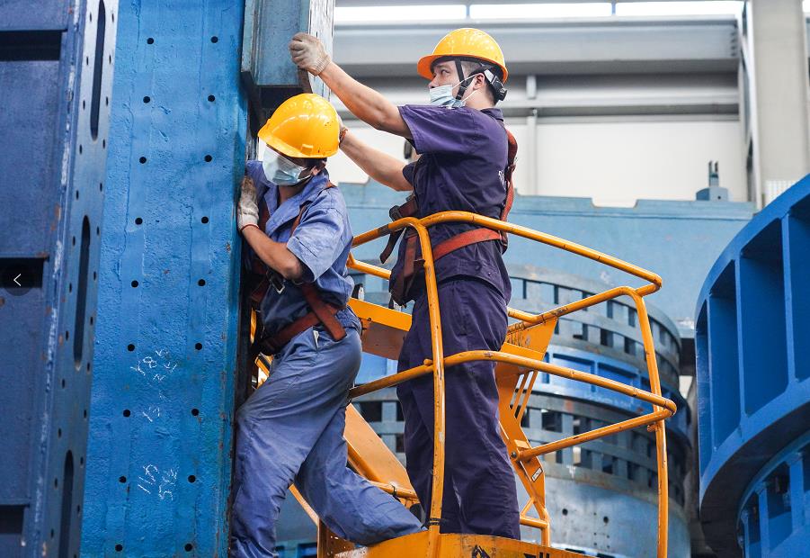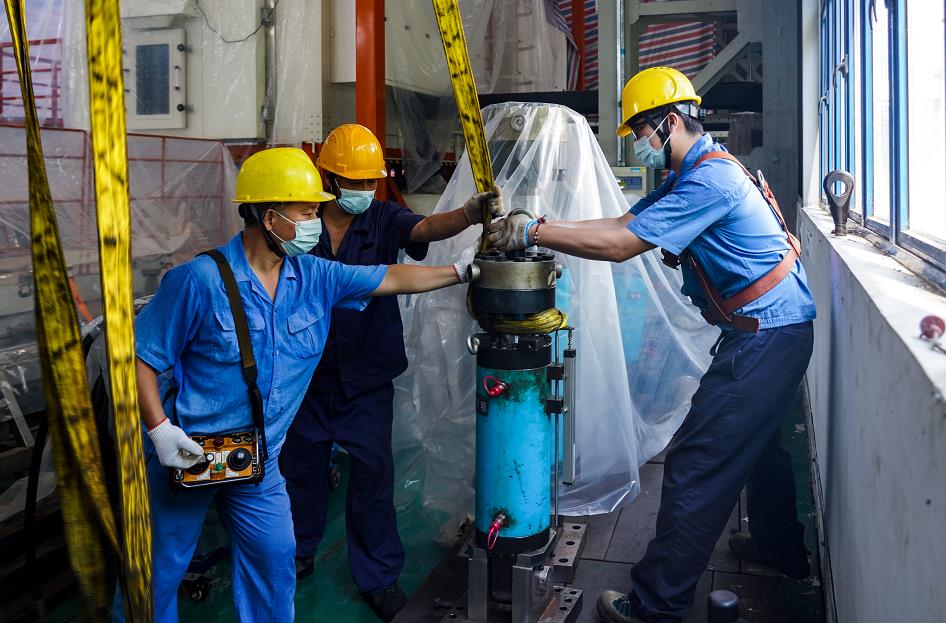 “现在条件好了,登高爬上六七米高的梯子,安全也提高了。”金师傅回忆说,在过去装备还没有升级到升降车时,登高作业全靠爬上六七米高的铸块。说话间,安装工钱剑从设备底部从大约仅有半平方米大小的“人口”钻出来,仅仅在里面呆上一会儿,他的额头已经遍布细密的汗珠。由于底部的内部空间受限,钱剑只能一步步挪着走,而在大量的测试装备里,这还算得上舒服的。由于一切测试紧跟产品,特殊产品规模大小不一,究竟如何开展工作完全取决于需要测试的产品型号的规模尺寸。而就在几天后,一套大型产品由于高度过高只能在户外进行测试,挑战更为严峻。