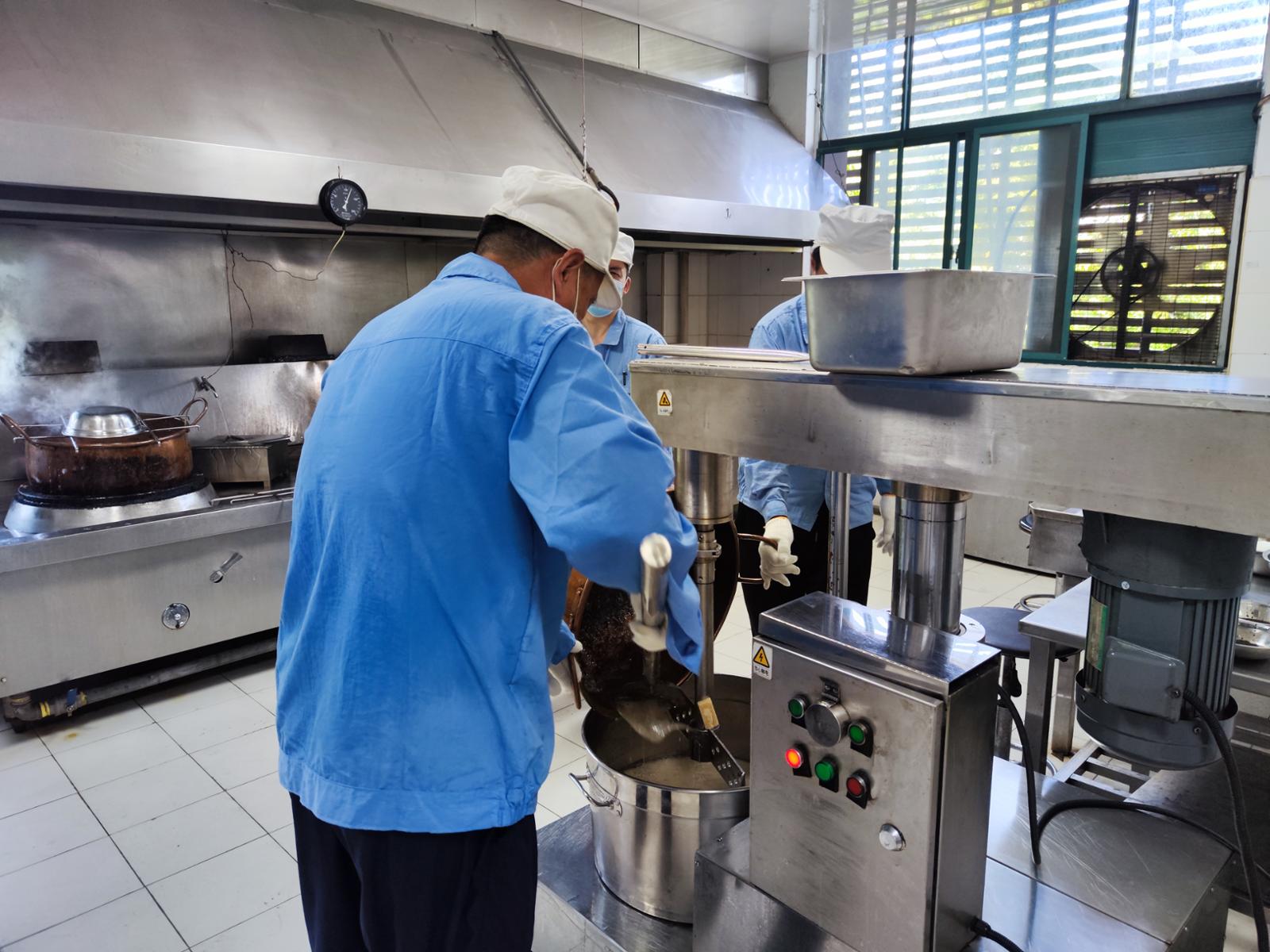 今年上海的夏天可以说是烈日灼人,在梨膏糖厂的生产车间内,四口大铜锅同时煮沸,室内的温度可以飙升至50度。周蓉蓉透露,在生产车间的几位职工每天都要换两波工作服,一锅煮沸大概要十分钟左右,煮两三锅就要停一停休息一会,否则实在是热得受不了。