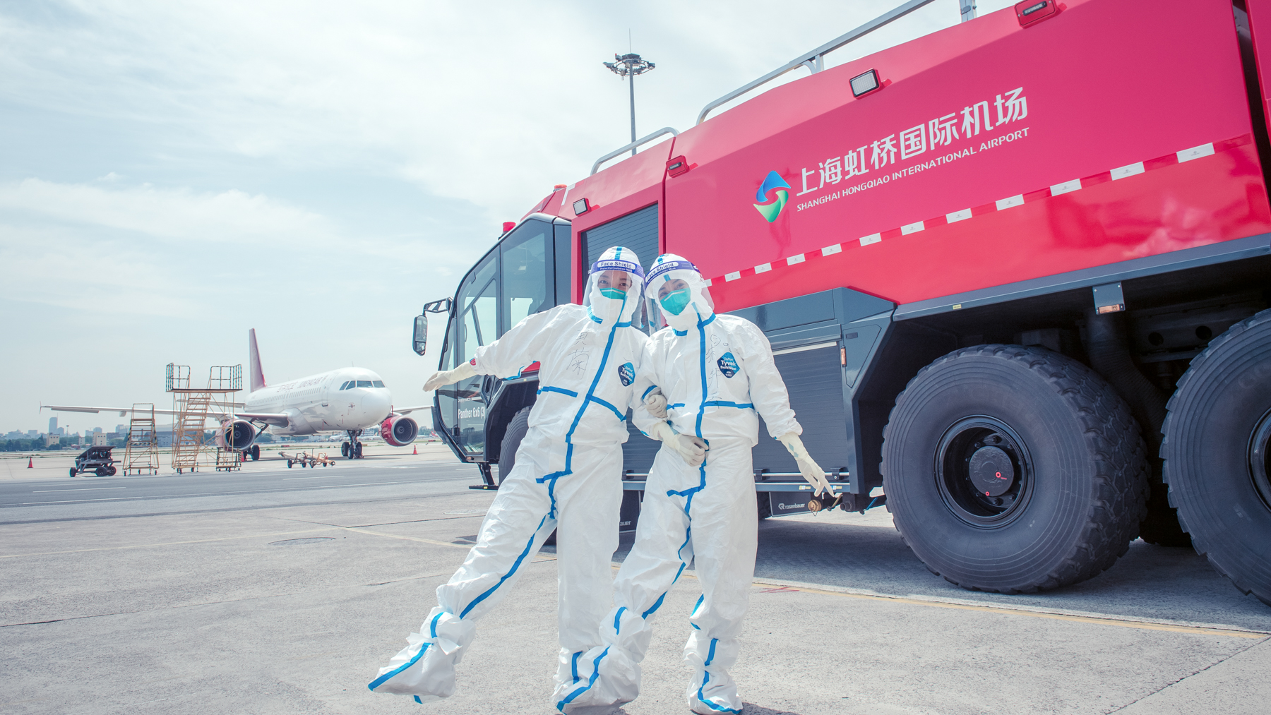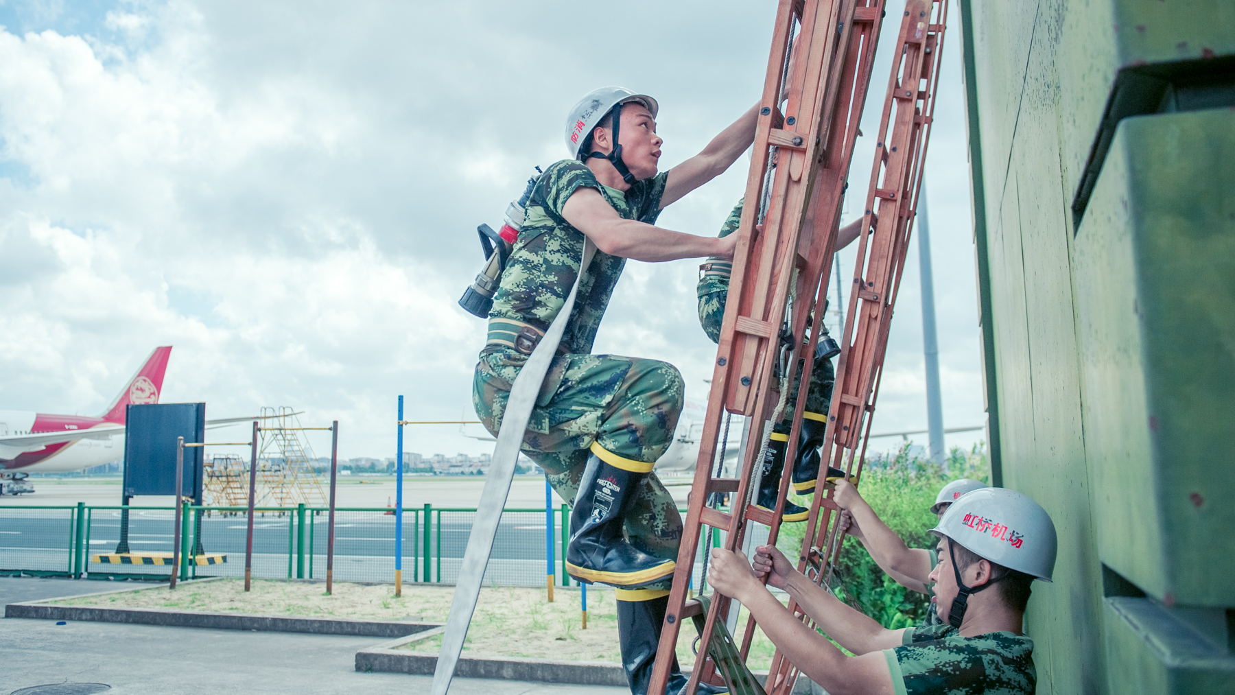 (头图:虹桥国际机场消防保障员头顶烈日进行训练。摄影/孙浩俊,虹桥国际机场责任有限公司)
