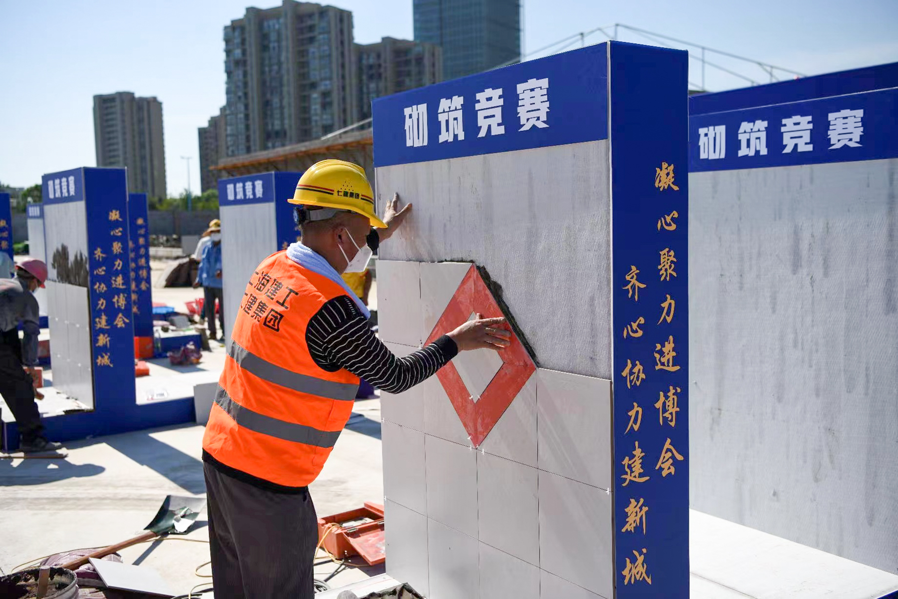 青浦区总工会举办劳动和技能竞赛,图为砌筑类竞赛现场。摄影/冯俊(青浦区总工会)