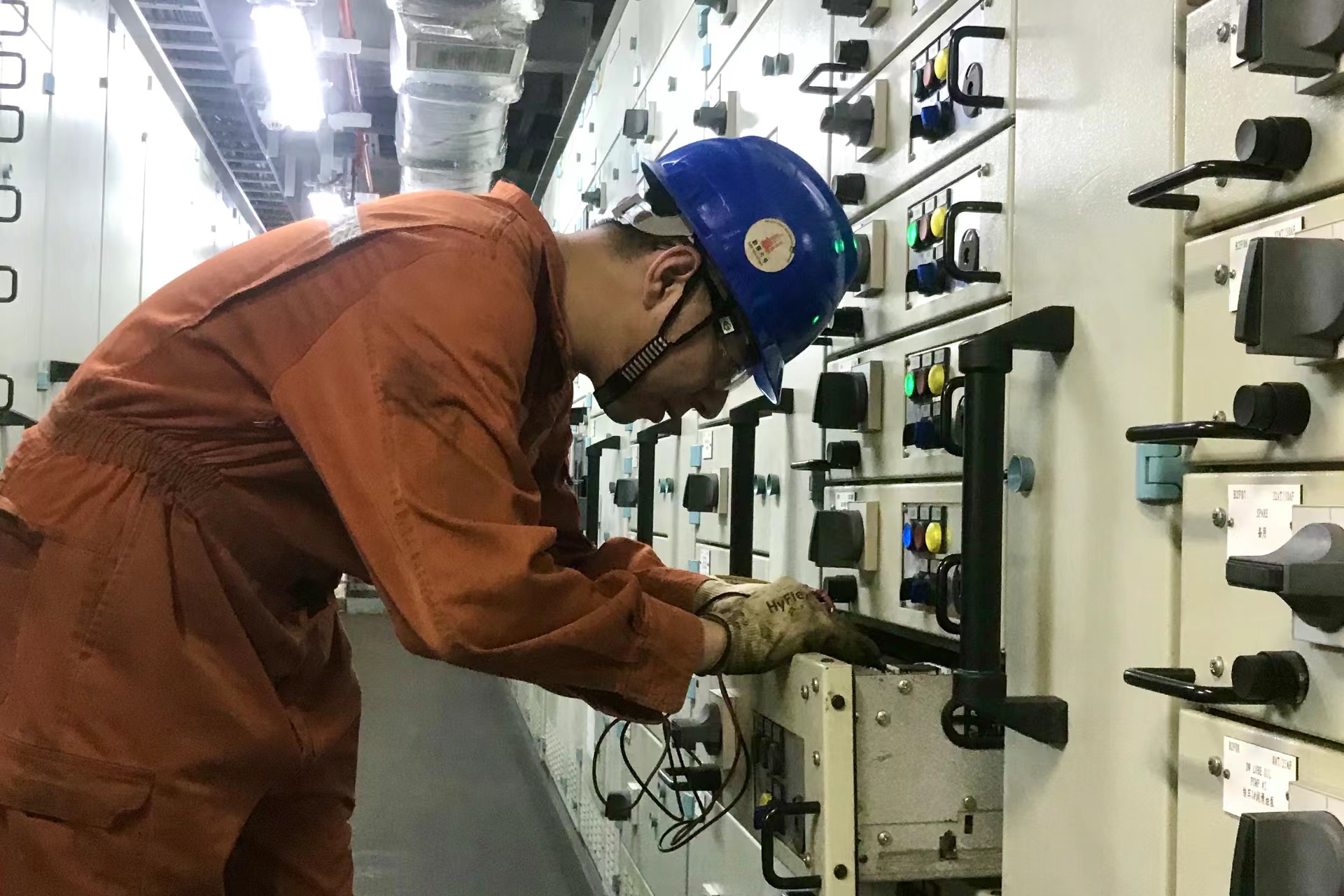 勘探六号,渤海,电气师周坚正在查找电气故障。